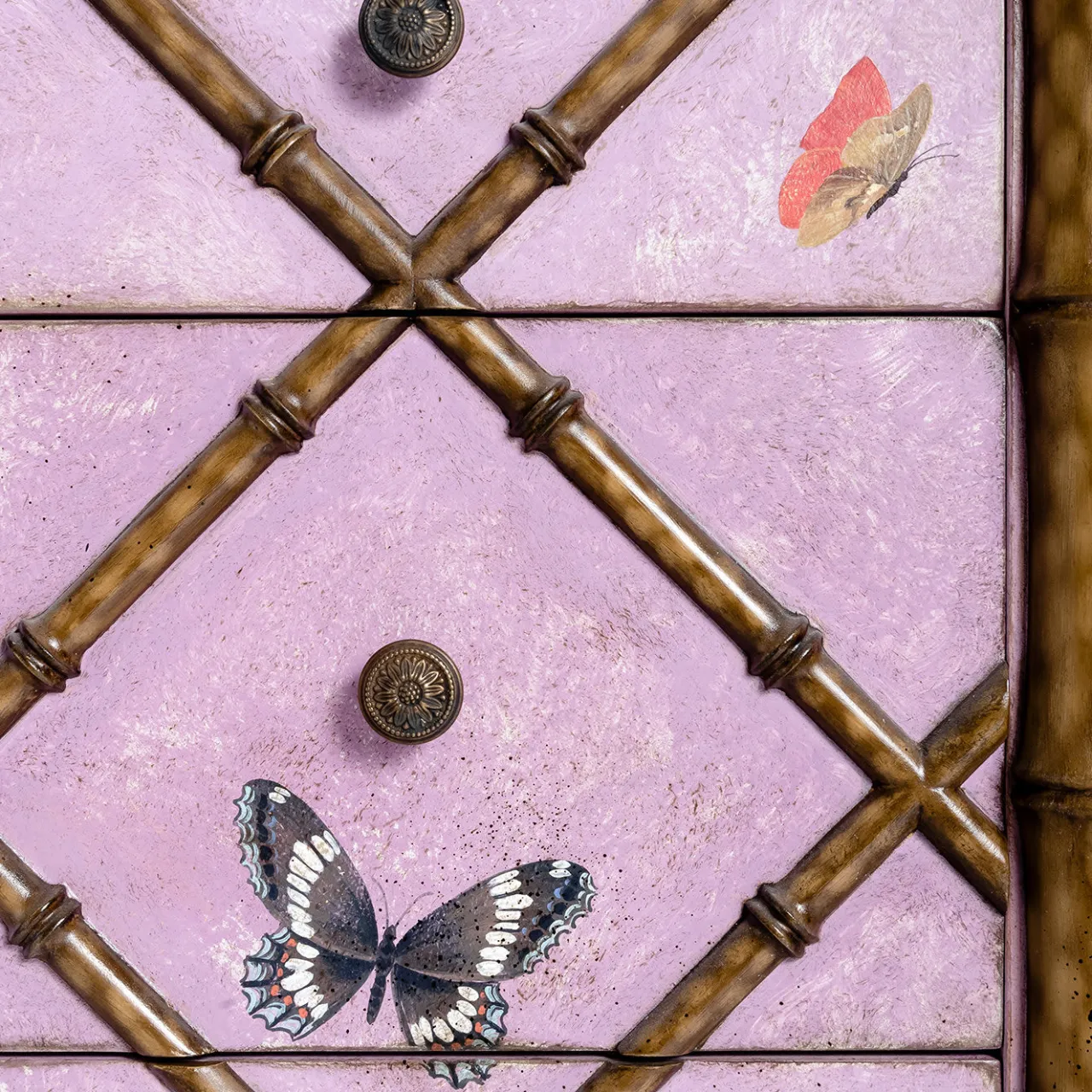Un forte tocco femminile contraddistingue questo comò in legno, un pezzo su misura decorato a mano secondo le antiche tecniche veneziane. Organizzato in sei cassetti, il mobile contenitore è sostenuto da sei gambe a forma di canna di bambù, il cui disegno richiamato sul frontale dei cassetti si fonde con il motivo delle farfalle multicolore sullo sfondo rosa. È disponibile un ulteriore strato protettivo per il piano. Completamente personalizzabile, contattate il Concierge.