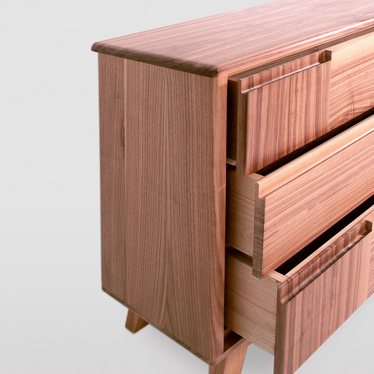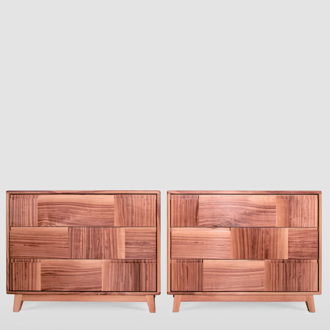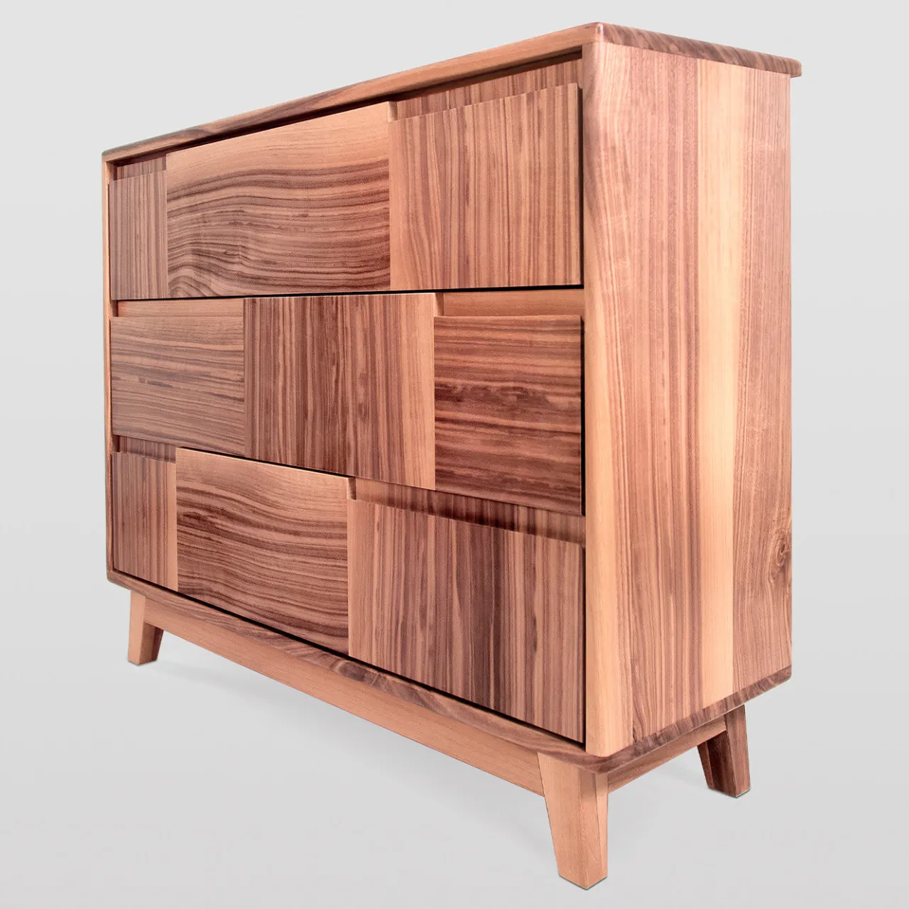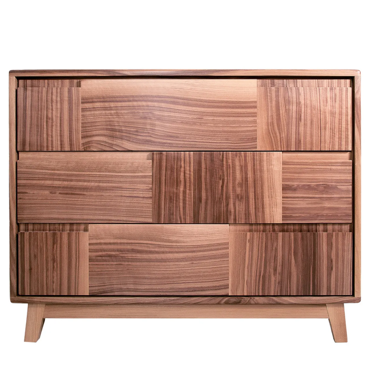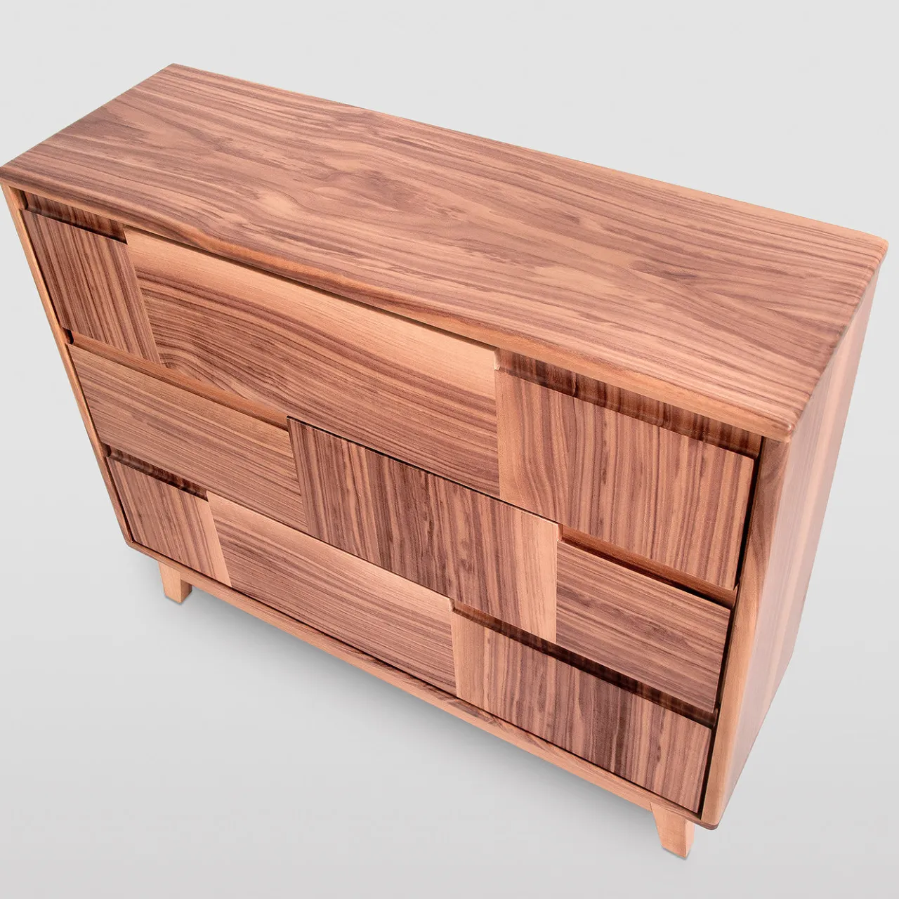 Linee slanciate e volumi decisi definiscono questo raffinato esempio di mobile italiano. Realizzato a mano in massello di noce canaletto, presenta tre cassetti con sistema di chiusura ammortizzata Blumotion, i cui pannelli frontali alternano pannelli verticali e orizzontali, creando superbi effetti di contrasto derivanti da orientamenti opposti delle venature. Le maniglie a scomparsa completano questo mobile minimalista che poggia su piedini inclinati e compatti. Si prega di verificare le opzioni di personalizzazione con il Concierge.