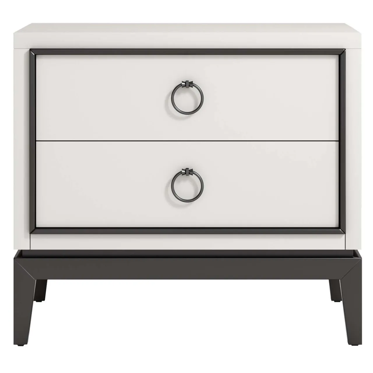 Questo splendido comodino è un complemento ideale per gli altri mobili Asmara White. La sua struttura in legno vanta una silhouette semplice, evidenziata dall’uso di due lacche a contrasto in bianco e nero. La base e i profili sono in legno massiccio con profilo nero, mentre il piano e i lati, così come la parte anteriore dei due cassetti, sono verniciati con una lacca bianca. L’effetto è elegante e senza tempo. Le maniglie in metallo bronzato continuano questo gioco di contrasti, che può avere un effetto diverso se si scelgono altre finiture.