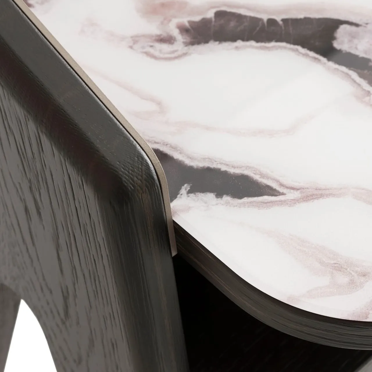 Versione da comodino dell’omonimo scrittoio, questo sofisticato design combina linee fluide e finiture preziose. Le gambe in rovere massiccio con finitura Laguna affiancano la raffinata struttura in metallo calandrato con finitura champagne, che avvolge un sorprendente piano in vetro retro-stampato con un superbo effetto marmo Trinity White. Un pratico ripiano impiallacciato in rovere Laguna completa il design.