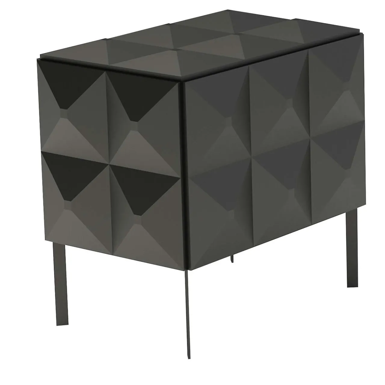 Questo elegante comodino rettangolare con cassetto a ribalta è rivestito con piastrelle magnetiche piramidali di sezione 15×15 cm. Il comodino è interamente realizzato in MDF testurizzato laccato nero opaco, mentre la base è in metallo laccato della stessa tonalità, con sezione 25×5 mm. Possibile fornitura del solo kit di piastrelle.