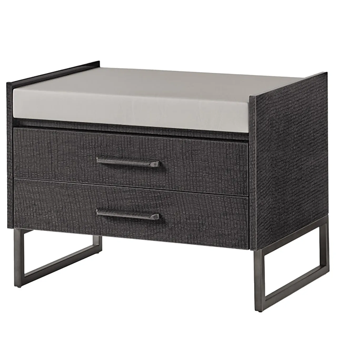 Comodino composto da due cassetti. Particolare finitura in legno impiallacciato effetto pitone disegnata dall’architetto Piero Lissoni. Composto da gambe in metallo, maniglia in legno e piano in pelle. Finiture Pitone opaco. Metallo grafite.