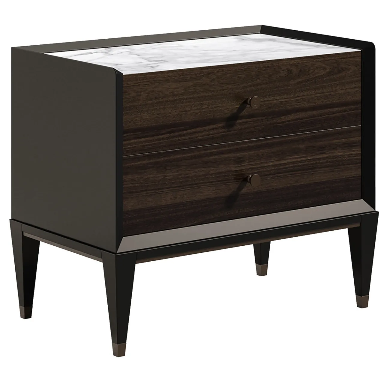 Parte della collezione Eclipse, la struttura austera di questo comodino moderno è rifinita in nero con effetto vellutato. L’unità a due cassetti, incassata, presenta pannelli frontali impiallacciati in marrone con maniglie rotonde in metallo e un sorprendente piano in marmo bianco. Abbinato a un gemello per accentuare i lati della struttura del letto Eclipse, questo sofisticato pezzo bicolore sarà una dichiarazione in camera da letto, ma potrebbe anche servire come tavolino funzionale e accattivante in un arredamento moderno e minimalista.