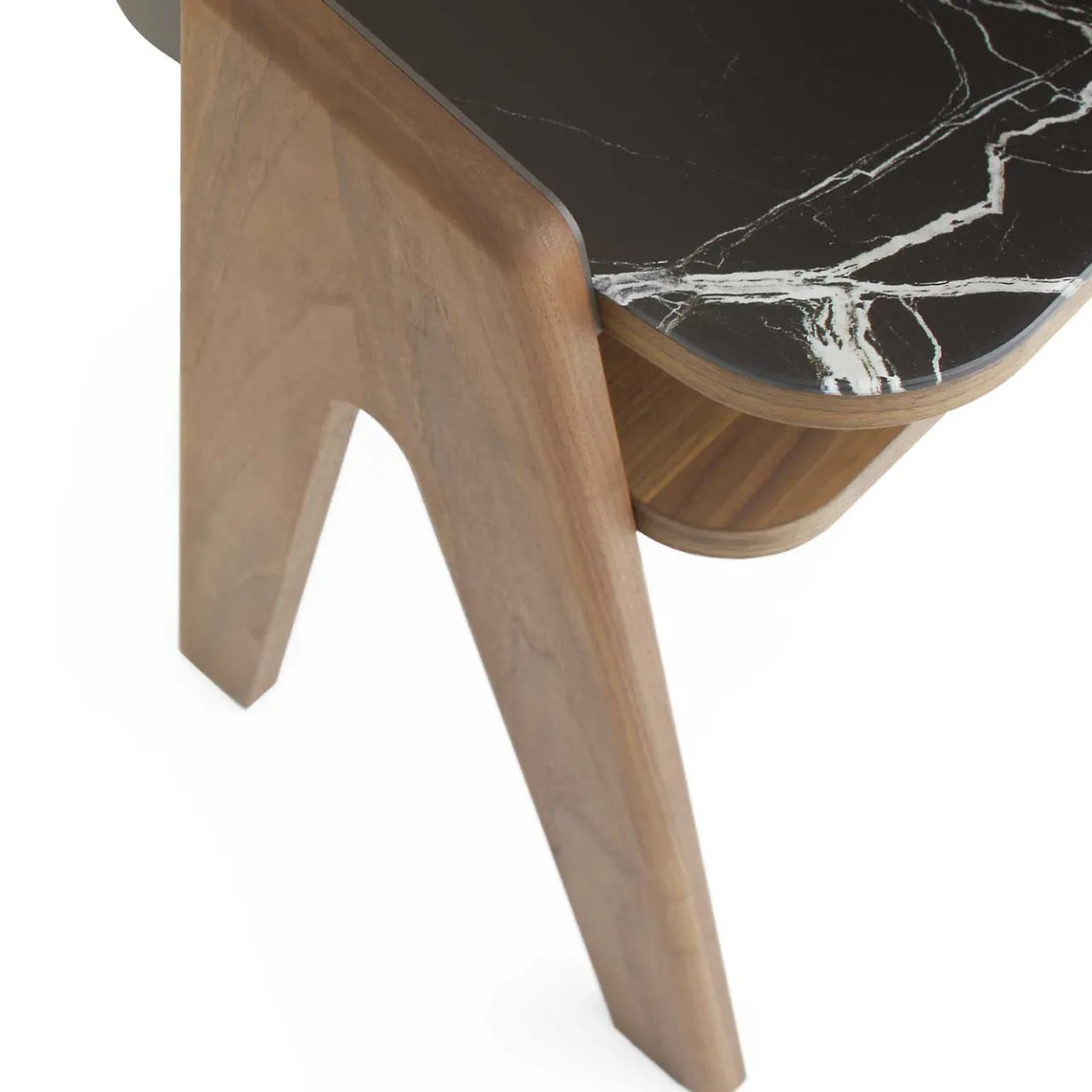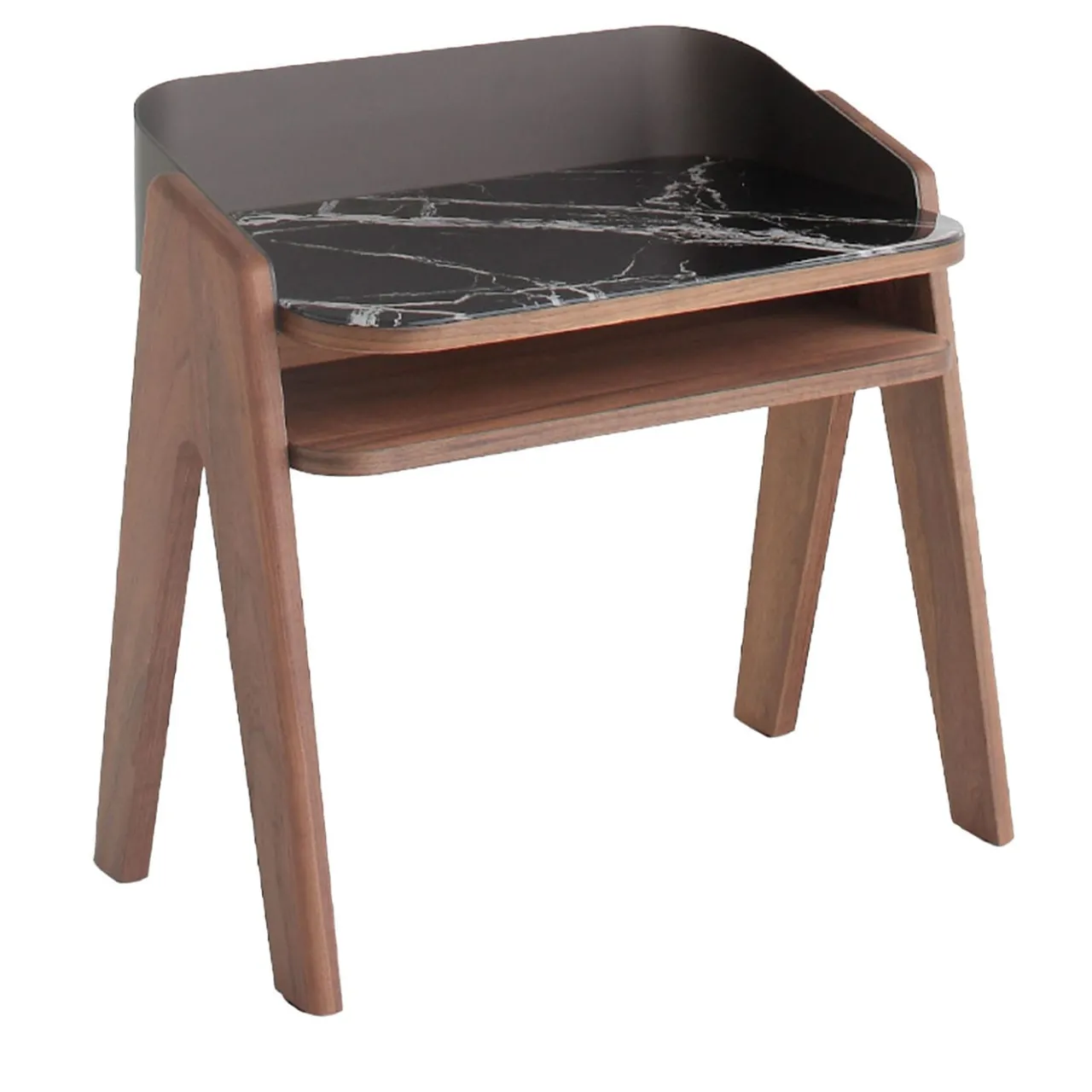 Idealmente abbinato alla sua controparte da scrivania per un esclusivo look coesivo, questo comodino seduce con le sue venature di noce e l’intrigante tracciato marmorizzato. L’avvolgente scocca in metallo calandrato, sostenuta da gambe a V in massello di noce canaletto, abbraccia il piano in vetro sagomato, che vanta una superba stampa posteriore in marmo Breccia Imperiale. Un pratico ripiano rivestito in noce canaletto completa il design.