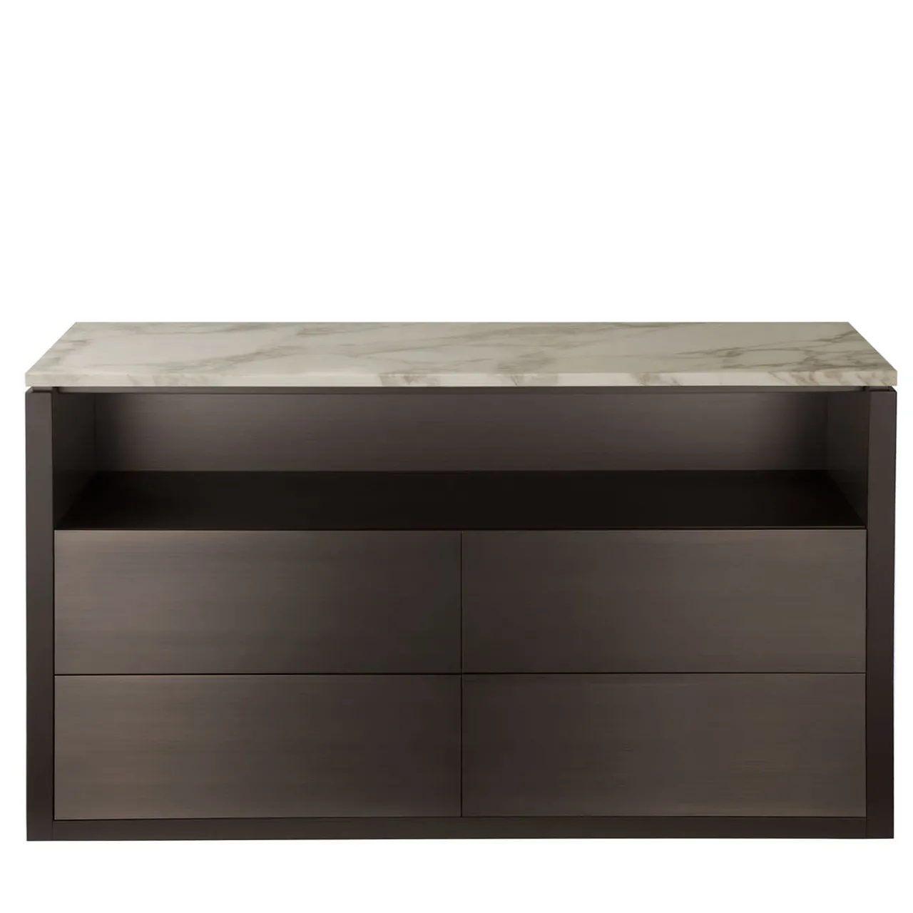 Questo raffinato comodino combina materiali nobili e linee essenziali in un design di metà secolo che si adatta a qualsiasi arredamento della camera da letto. Progettato dall’architetto italiano Davide Rizzo in collaborazione con AVD, questo grande pezzo ha una struttura elegante e rettangolare in ottone bronzato con quattro cassetti (due per lato) con finitura laccata opaca all’interno. Lo splendido piano in Calacatta Vagli Oro crea un contrasto visivo e materico che aggiunge un tocco di eleganza e raffinatezza al pezzo. L’ampio ripiano sotto il piano offre una comoda superficie per esporre oggetti decorativi o riporre libri e altri oggetti personali.