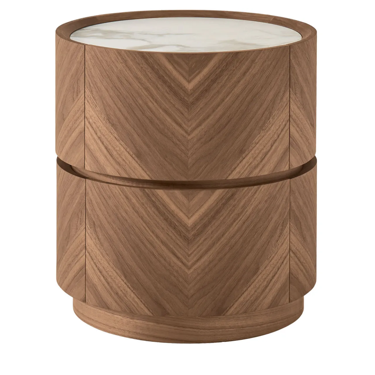 Questo comodino, che unisce i toni della terra all’eleganza della pietra, abbina un’impiallacciatura di noce a spina di pesce a un piano realizzato in lussuosa ceramica Calacatta. Il contrasto tra le ricche venature del legno e i motivi cremosi della ceramica crea un effetto visivo di grande impatto. I due cassetti senza maniglia si aprono senza sforzo, garantendo funzionalità e purezza estetica. Ideale per le camere da letto contemporanee, è un pezzo versatile che emana raffinatezza nel rispetto dei materiali naturali.