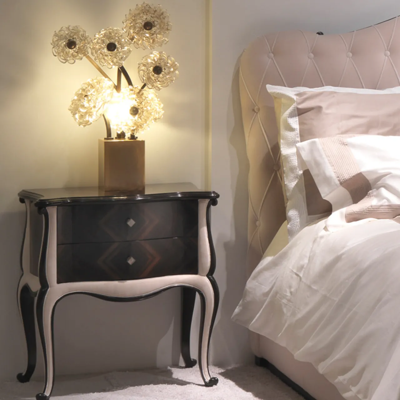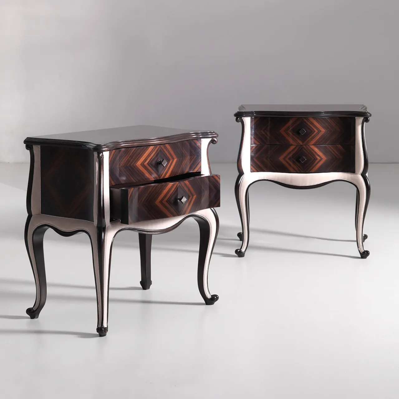 Sofisticato e aggraziato, questo comodino in ciliegio ed ebano Makassar infonderà un’eleganza senza tempo nelle camere da letto di ispirazione classica. Gli inserti in pelle chiara impreziosiscono le quattro gambe cabriole e i fianchi, creando un seducente contrasto con le vistose venature tipiche dell’ebano che adornano la cassettiera. Su richiesta, sono disponibili anche inserti in tessuto.