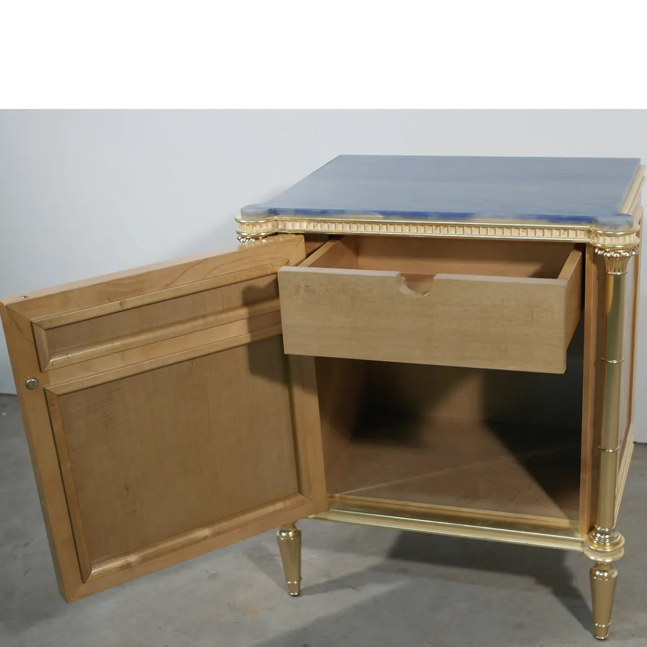 Questo comodino in legno a un’anta vanta una finitura lucida e accenti di impiallacciatura in paglia naturale. Completo di un cassetto interno, il design è impreziosito da dettagli in ottone con finitura placcata oro 22 carati. Gli accenti in foglia d’oro 22k presentano un leggero trattamento di patina bianca. Il frontale è rivestito in seta naturale, sormontato da lastre di vetro con un motivo decorativo a rombi. Il piano è in marmo Azul Macaubas.