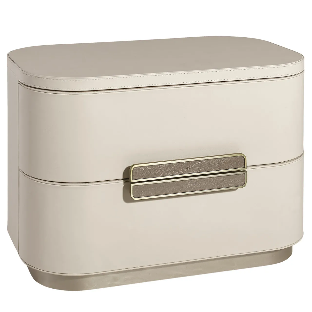 Questo comodino è un’aggiunta di lusso alle camere da letto moderne e sofisticate, un trionfo di curve morbide e di artigianato sartoriale. La struttura è interamente rivestita in pelle beige di prima scelta, creando una tela pregiata e luminosa per le due maniglie con inserti in vetro gioiello e contorni rifiniti con vernice metallizzata anticata, proprio come la base a zoccolo. Un regalo meraviglioso per una persona cara nelle occasioni speciali.