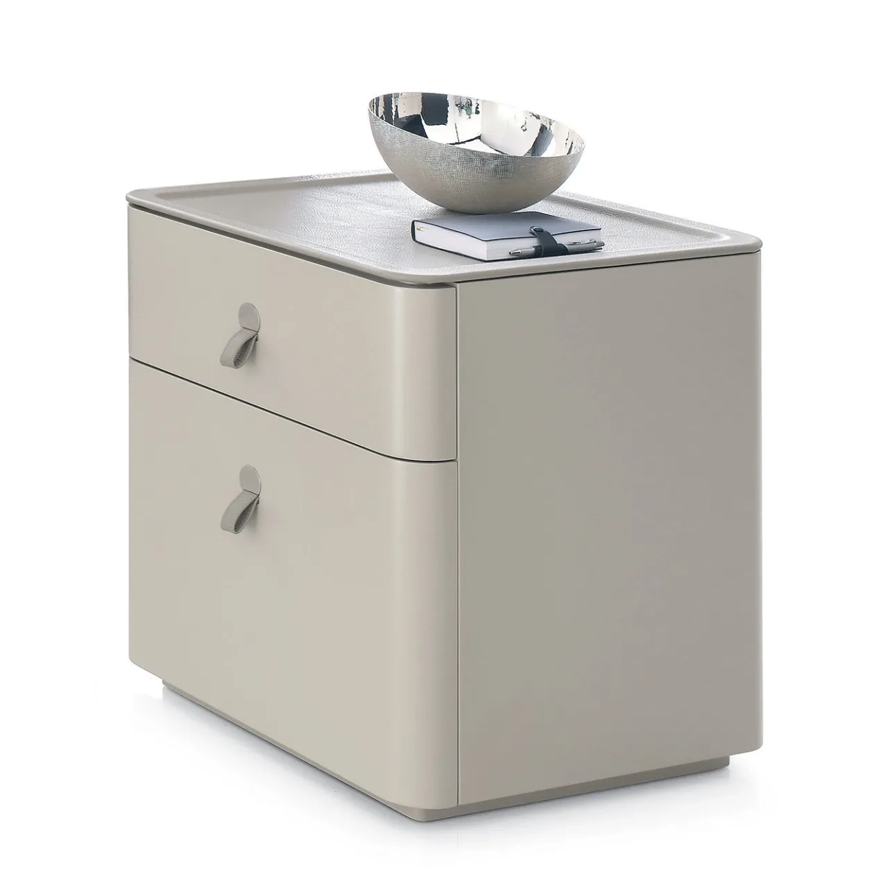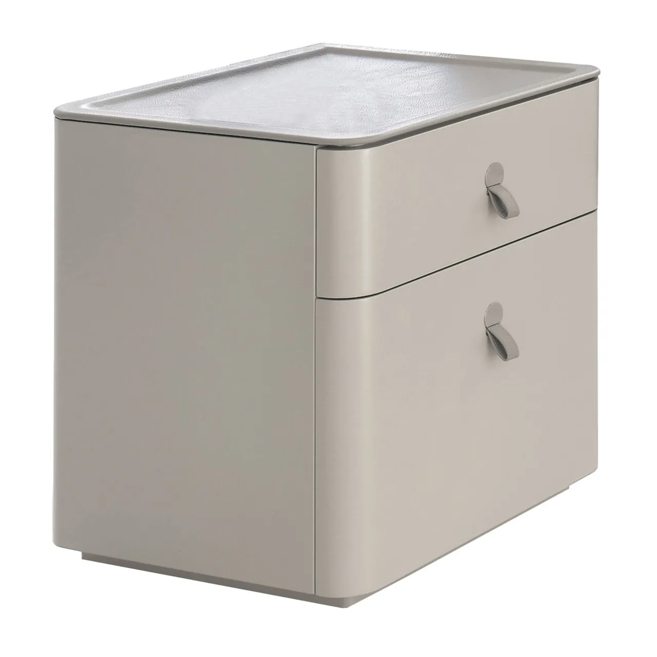 Elegante comodino disponibile in MDF laccato opaco color tortora. Il top è in pietra acrilica rivestita in pelle pregiata Ice E 216. Dotato di guide metalliche con chiusura soft-close, i frontali dei cassetti riprendono la struttura in MDF laccato opaco. Le maniglie in pelle con inserti in metallo aggiungono un tocco di raffinata eleganza. Disponibile anche in altre finiture. Contattare il Concierge per maggiori dettagli. Design di Giuseppe Bavuso.