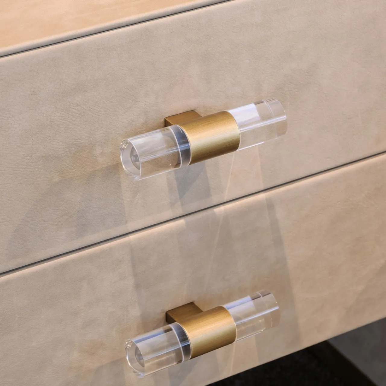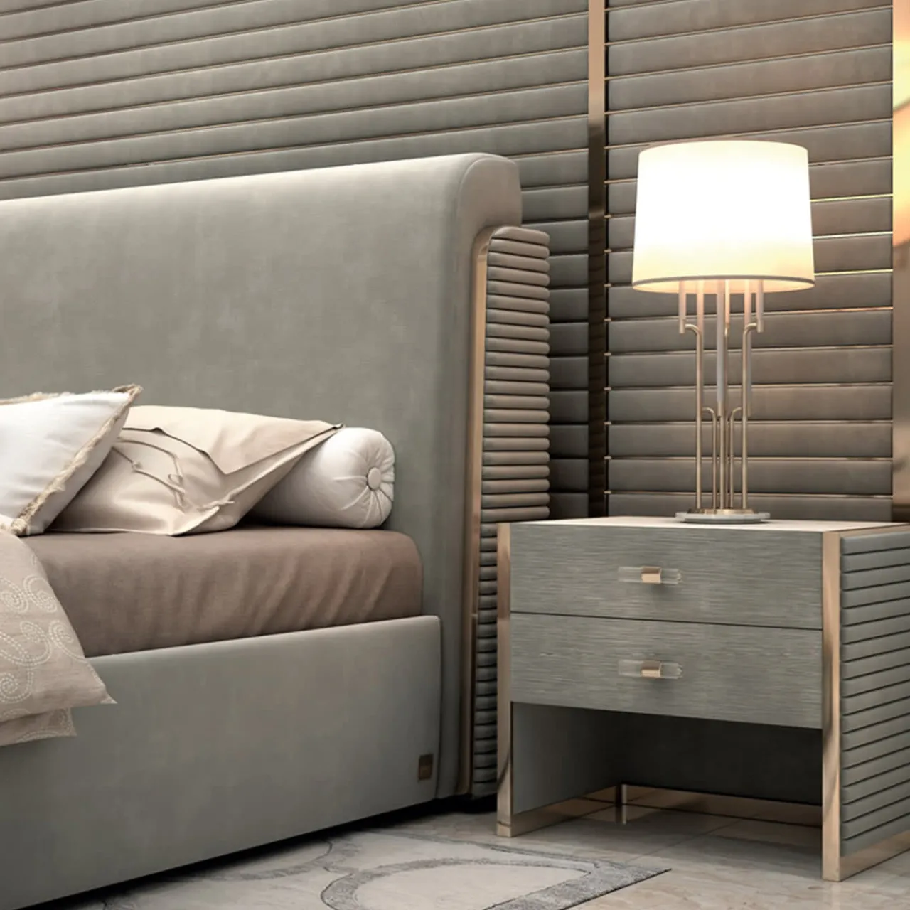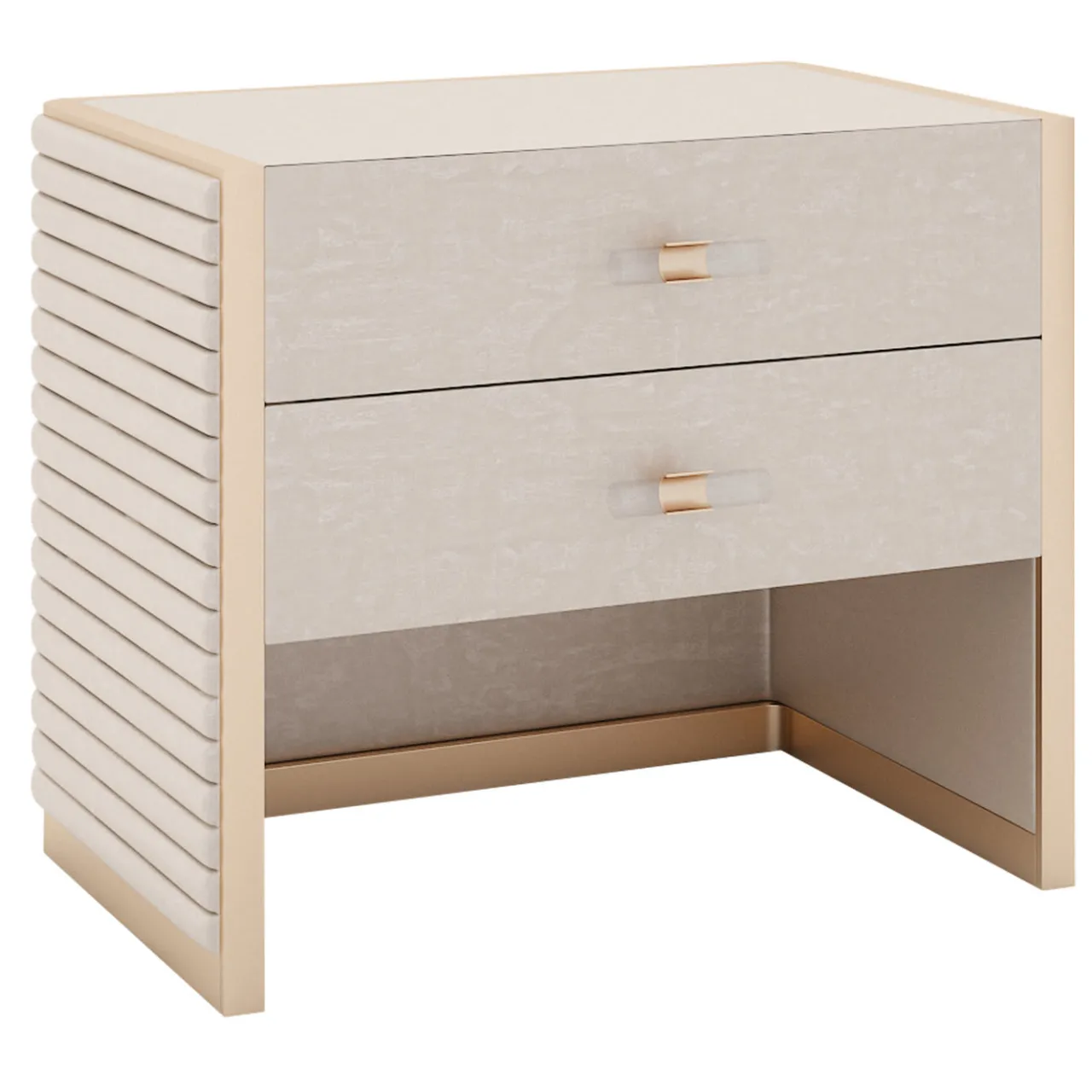Dettagli minuziosi e linee raffinate caratterizzano il design di questo comodino in legno lucido. Interamente rivestito in tessuto grigio chiaro e impreziosito da dettagli metallici brillanti e rifiniti in ottone, il fascino di questo pezzo deriva dall’elegante armonia tonale e dalla texture sporgente finemente lavorata che ne abbellisce i lati esterni. Dotato di due cassetti, questo comodino può essere rivestito in pelle o personalizzato con altre finiture e colori; per maggiori dettagli, rivolgersi al Concierge.