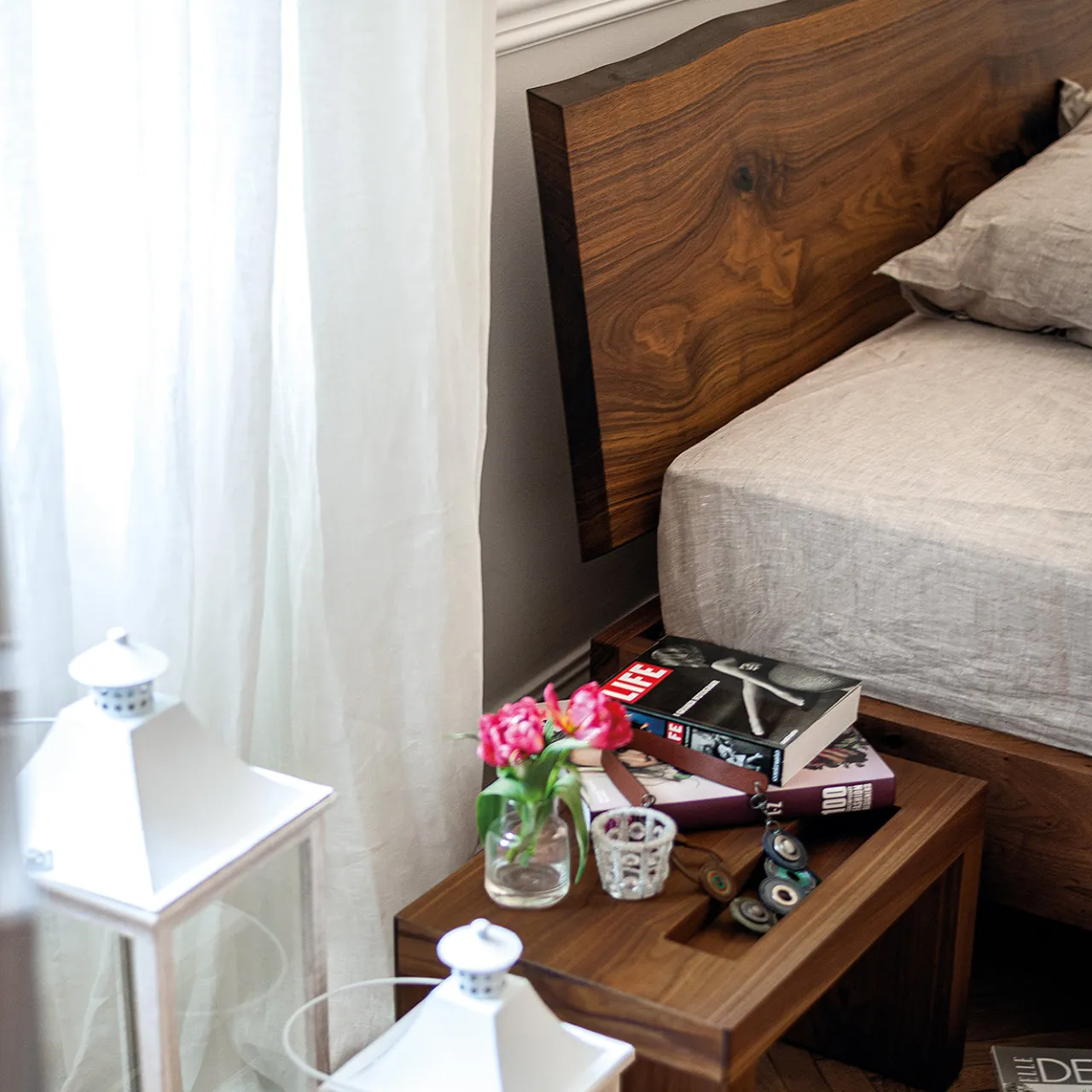 Il comodino Night-Night è realizzato in noce massello con una finitura a olio liscia che valorizza la venatura naturale del legno e le superfici prive di nodi. Dispone di un pratico vano superiore per riporre piccoli oggetti e di un cassetto costruito con tradizionali incastri a coda di rondine, garanzia di solidità e durata nel tempo. Progettato da Terry Dwan, questo pezzo unisce funzionalità e raffinata artigianalità, ideale per completare una camera da letto dallo stile contemporaneo.
