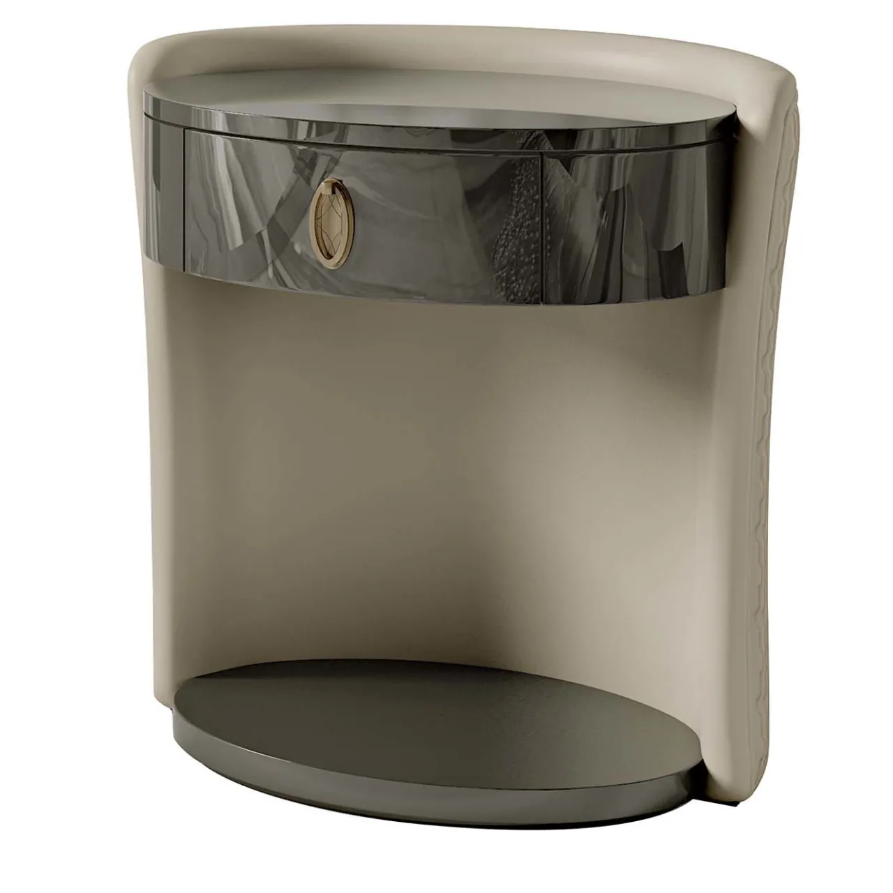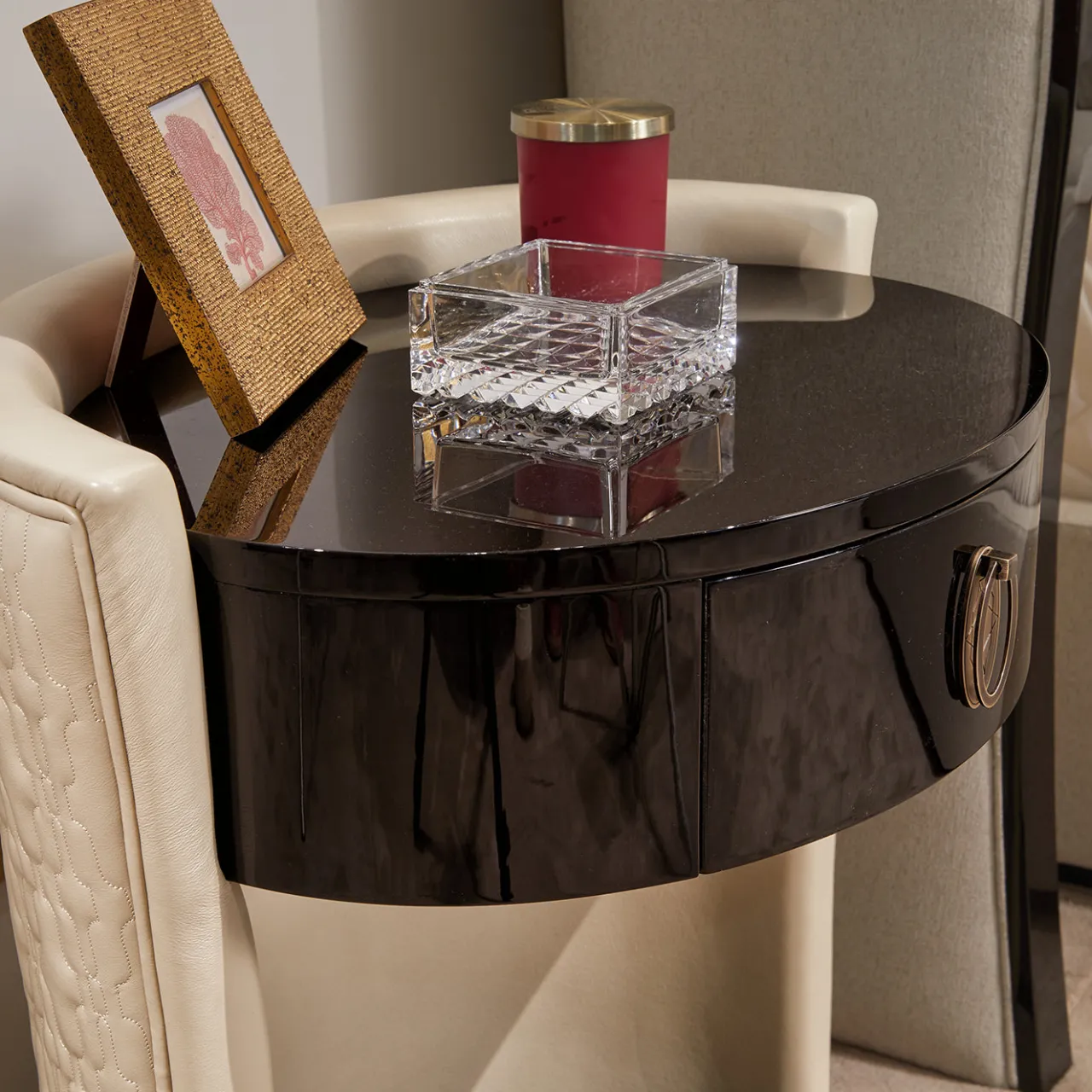 Progettato per essere visto da ogni angolazione, il comodino Romantic ha uno stile davvero originale. Su una base ovale, il comodino è realizzato in legno con una splendida finitura laccata. Il tavolino è poi rivestito in pelle con un’affascinante finitura trapuntata. Il comodino fa parte di una piccola collezione di arredi per la camera da letto.