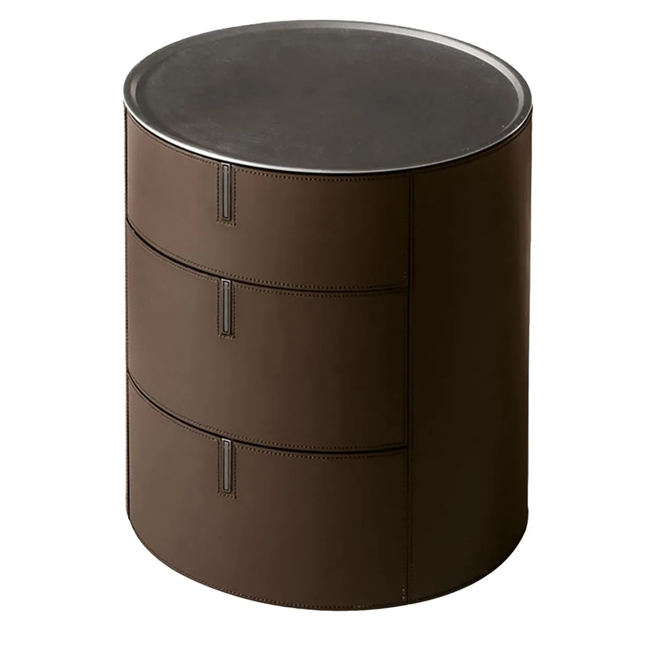 Questo comodino presenta una struttura in MDF piegata a vapore, rivestita in pelle con cuciture decorative. Ognuno dei tre cassetti scorre senza fatica su guide metalliche, con frontali rivestiti in pelle e impreziositi da cuciture decorative. Completano il suo fascino le eleganti maniglie in metallo e la scelta di vassoi in acciaio nelle finiture peltrox, bronzo, titanio o champagne. Disegnato da Giuseppe Bavuso, questo pezzo aggiunge un tocco di giocosa eleganza a qualsiasi camera da letto.