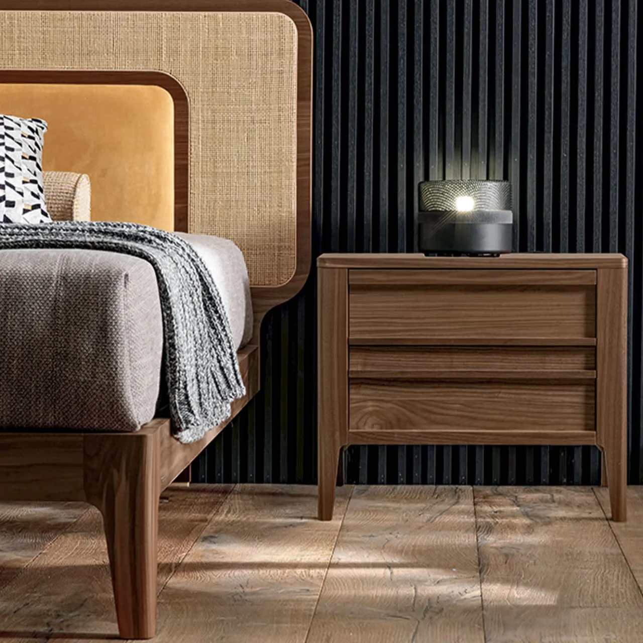 Comodino con due cassetti e maniglie integrate in legno Canaletto Origine.