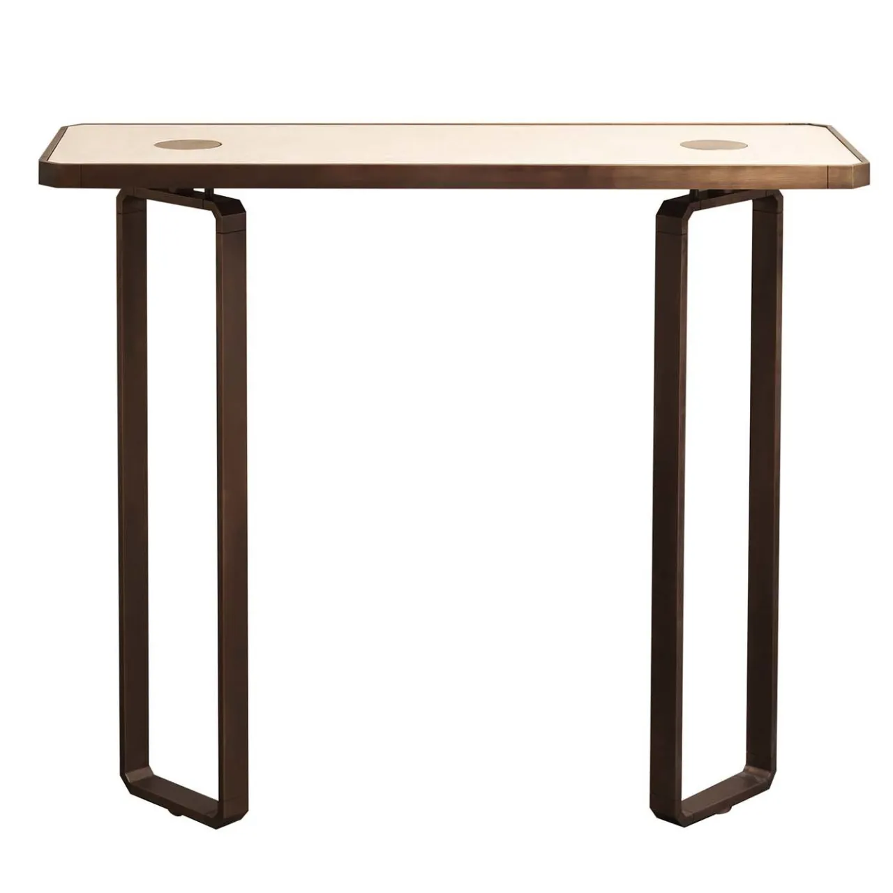 Il design giocoso e minimalista di questa consolle di Ciamaroli Queda Studio è un complemento elegante e moderno per un ingresso o un soggiorno, dove la sua forma contenuta si adatta a qualsiasi ambiente. La base in ottone è composta da due rettangoli con angoli arrotondati posizionati in diagonale e che sostengono una forma identica all’elegante piano in marmo Travertino. Due cerchi d’ottone sulla superficie della pietra fanno pensare a un pezzo di domino. La console deve essere fissata alla parete. Il prodotto è dotato di un foro sul retro realizzato per garantire la massima stabilità nel fissaggio alla parete.