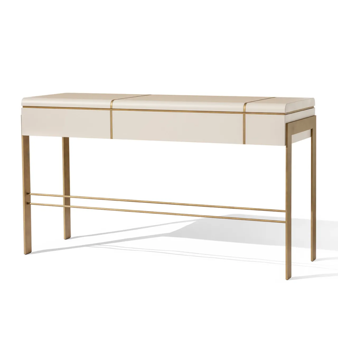Assolutamente elegante nel suo design pulito ed elegante, questa consolle sarà un pezzo iconico per un ingresso contemporaneo e lussuoso. Combinando un’intramontabile laccatura bianca con dettagli in metallo spazzolato, presenta gambe a barra piatta e un piano dolcemente arrotondato, dotato di due pratici cassetti. Personalizzabile su richiesta, chiedere al Concierge per i dettagli.