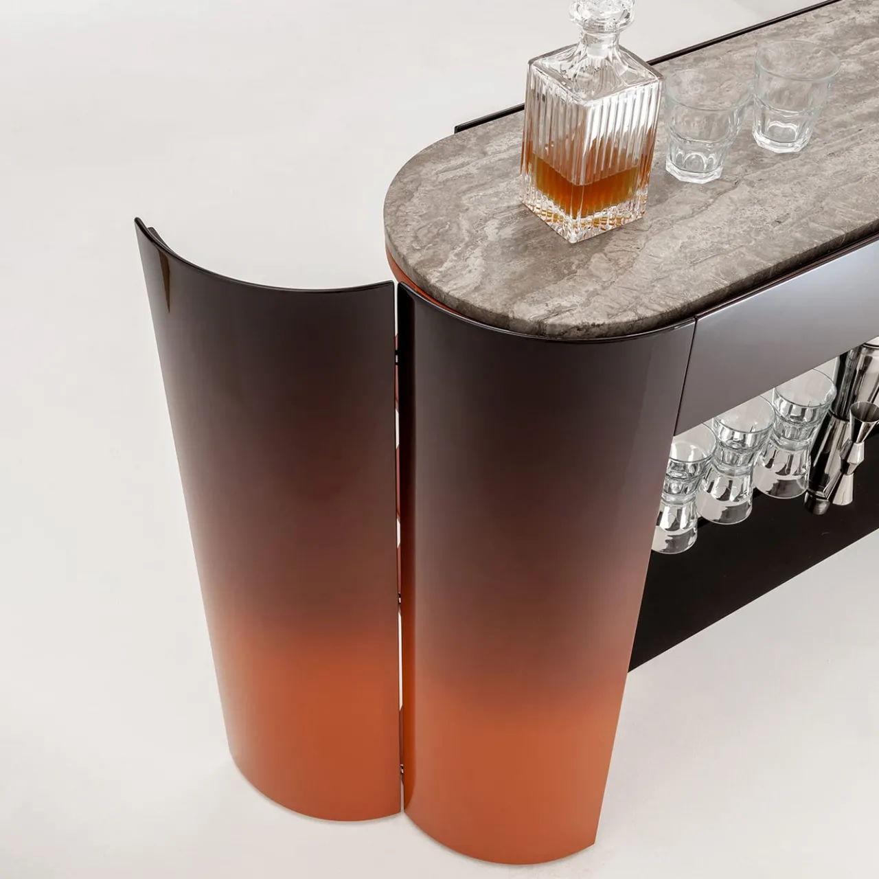 Consolle in lacca lucida sfumata RAL 8004, con piano superiore in marmo Travertino grigio e ripiano inferiore in acciaio lucidato a specchio. Dotata di due cassetti sotto il piano superiore. Le gambe sono dotate di ante apribili attrezzate e di ripiani interni. Ispirata all’iconico mobile contenitore Collectionist, la consolle adotta un design morbido e curvilineo, ideale per creare un angolo bar in casa di alto livello. Ogni dettaglio è stato studiato per garantire una funzionalità raffinata, dove comfort e bellezza si fondono perfettamente.