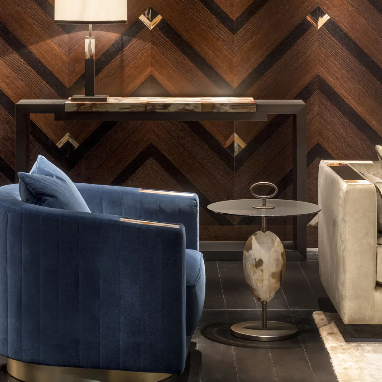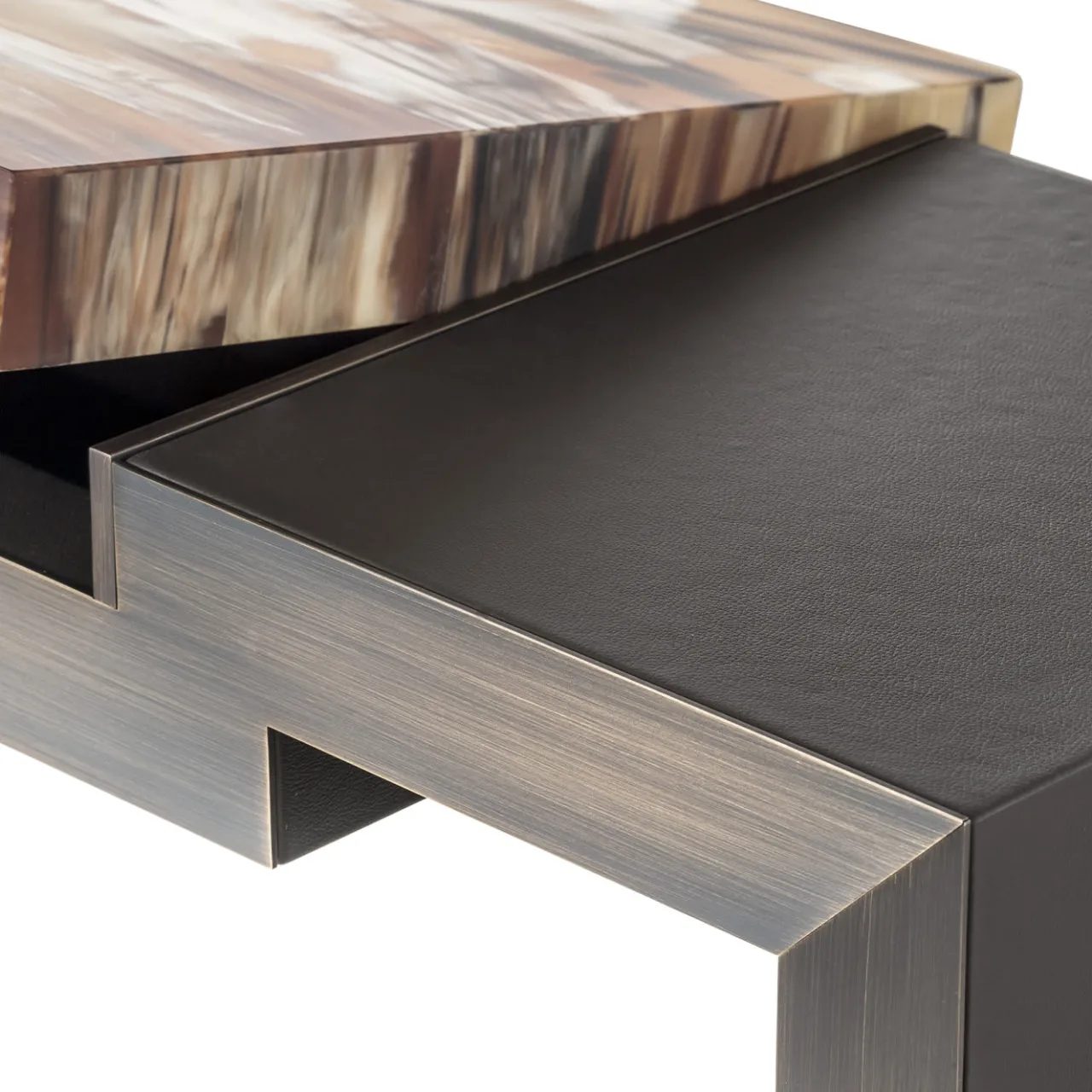 Imponente ed esteticamente unica, questa consolle fonde qualità funzionale e design in una silhouette lineare ed essenziale arricchita da ricchi dettagli. La struttura aperta si allunga in vera pelle marrone creando uno spazioso ripiano sottostante. Un cassetto con chiusura morbida si nasconde sotto l’accattivante inserto in corno naturale con bordi in ottone brunito al centro in alto. Le linee geometriche e le texture contrastanti conferiscono un fascino glamour che si adatta a qualsiasi sala da pranzo, soggiorno o camera da letto, sia in ambienti moderni che tradizionali.