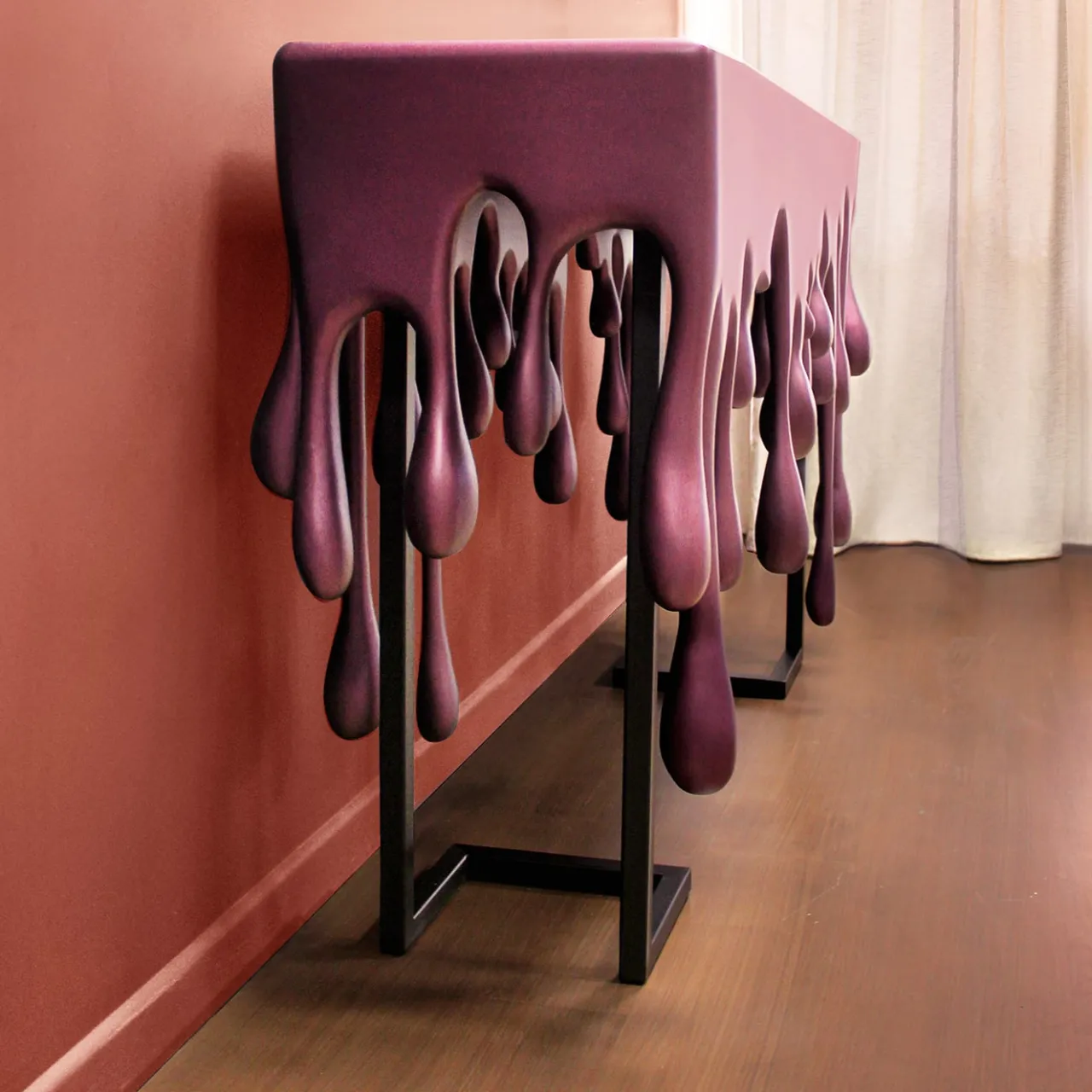 Consolle in legno intagliato e ferro. Il piedistallo è laccato nero opaco, il ripiano e le gocce sono laccati bordeaux cangiante.