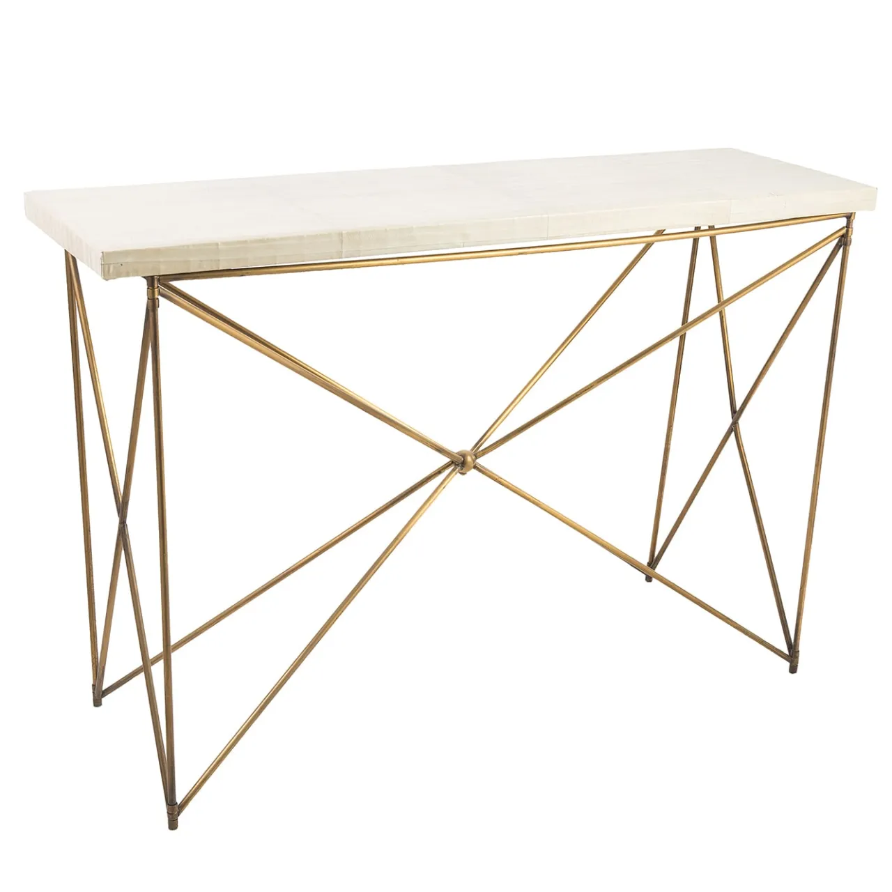 La consolle “Filo” è uno splendido esempio di lusso artigianale. Realizzata in vera pelle di anguilla bianca e impreziosita da una cornice in ottone brunito decorata a mano, questa consolle emana eleganza e raffinatezza. La pelle morbida ed elastica e i toni caldi e metallici dell’ottone creano un contrasto sorprendente.