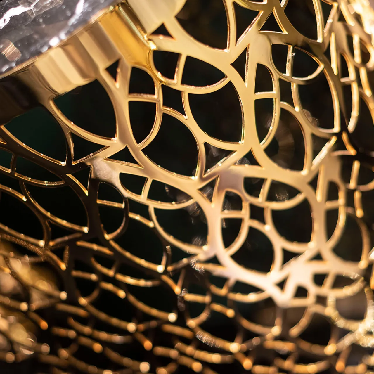 Le linee morbide e lo stile unico della consolle Fitzgerald di Arabesque la rendono la scelta ideale per un salotto moderno e lussuoso, per un foyer o per un salone d’albergo. Questo design glamour, che unisce l’Art Déco all’ispirazione contemporanea, abbina una base in oro lucido a un piano in marmo nero. Le gambe traforate in metallo presentano un elaborato traforo, messo in risalto dalla forma curva che abbraccia il piano ovale allungato.