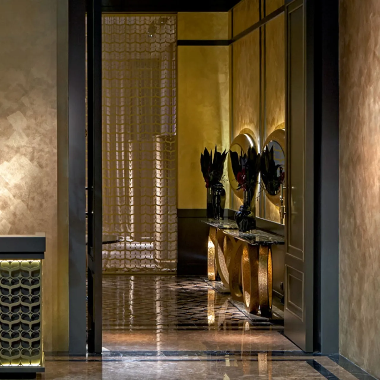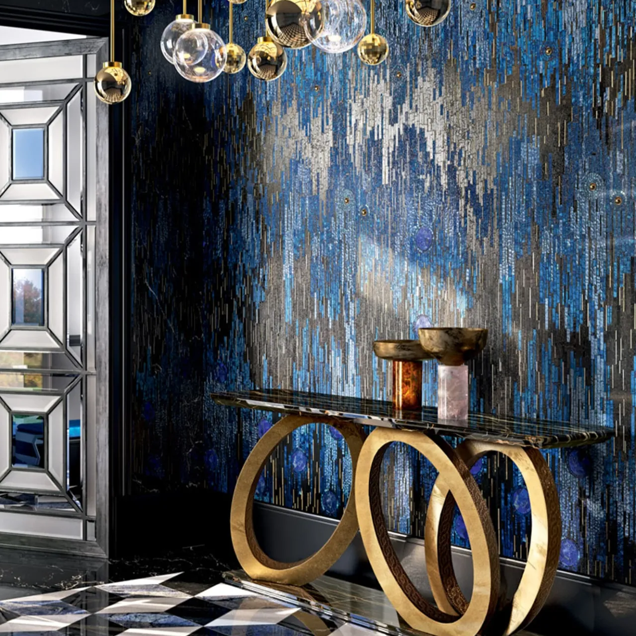 Linee sinuose contraddistinguono questa consolle, creata secondo i più alti standard di qualità. Rifinita nelle eleganti tonalità del mosaico metallico con un piano in marmo lucido per una maggiore brillantezza.