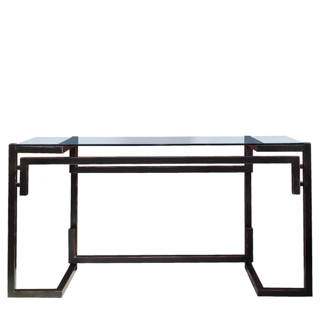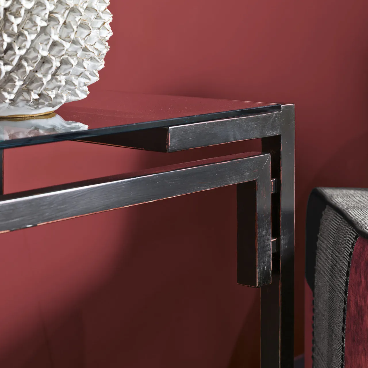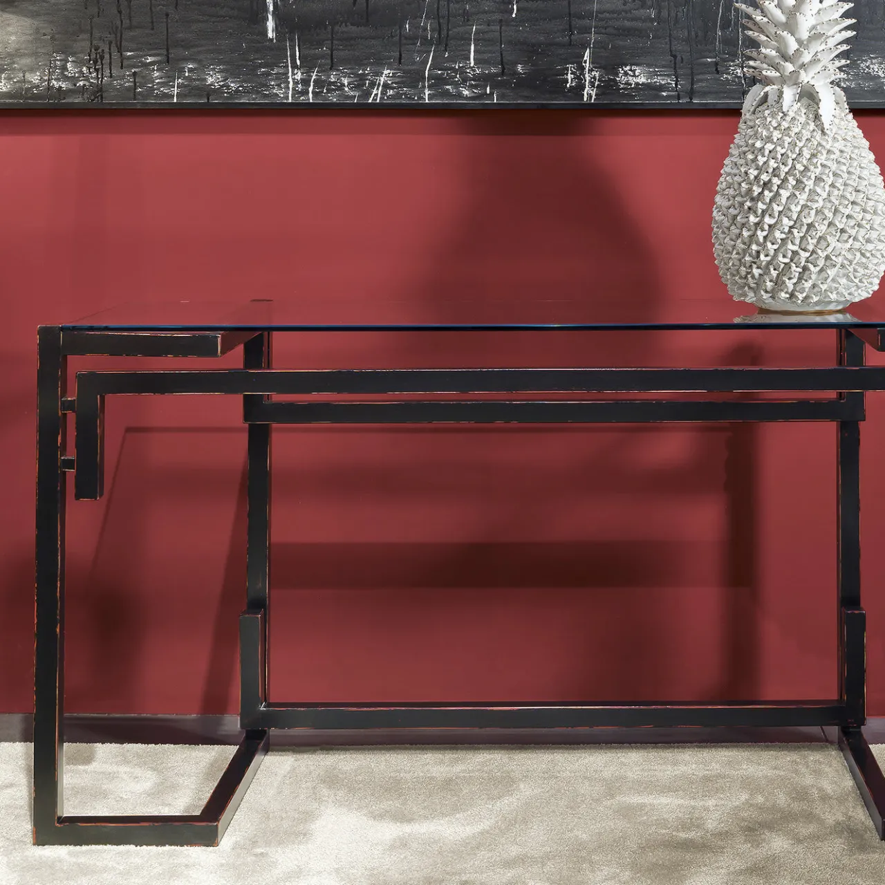 La struttura in legno di questa raffinata consolle è messa in risalto da un’accattivante vernice nera applicata a mano e dal piano in vetro trasparente, che offre una visione libera della base da qualsiasi angolazione. Questo pezzo di arredamento funzionale è un’aggiunta straordinaria a un ingresso o a un soggiorno moderno e contemporaneo e sarà la base ideale per mettere in risalto oggetti da collezione, lampade o composizioni floreali.