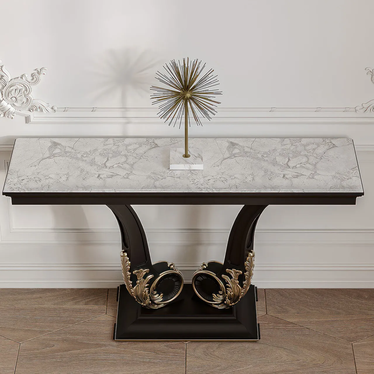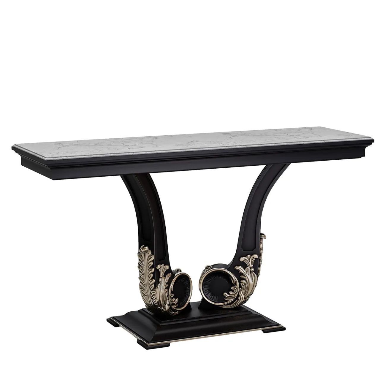 Questa console presenta un design raffinato con una solida struttura in legno laccato nero, arricchita da dettagli in foglia d’argento antico. L’eccezionale superficie in marmo di Carrara mette in risalto l’eleganza senza tempo e l’alta maestria di questo pezzo, rendendolo un’aggiunta di prestigio agli spazi ufficio o living che cercano una sofisticazione classica.