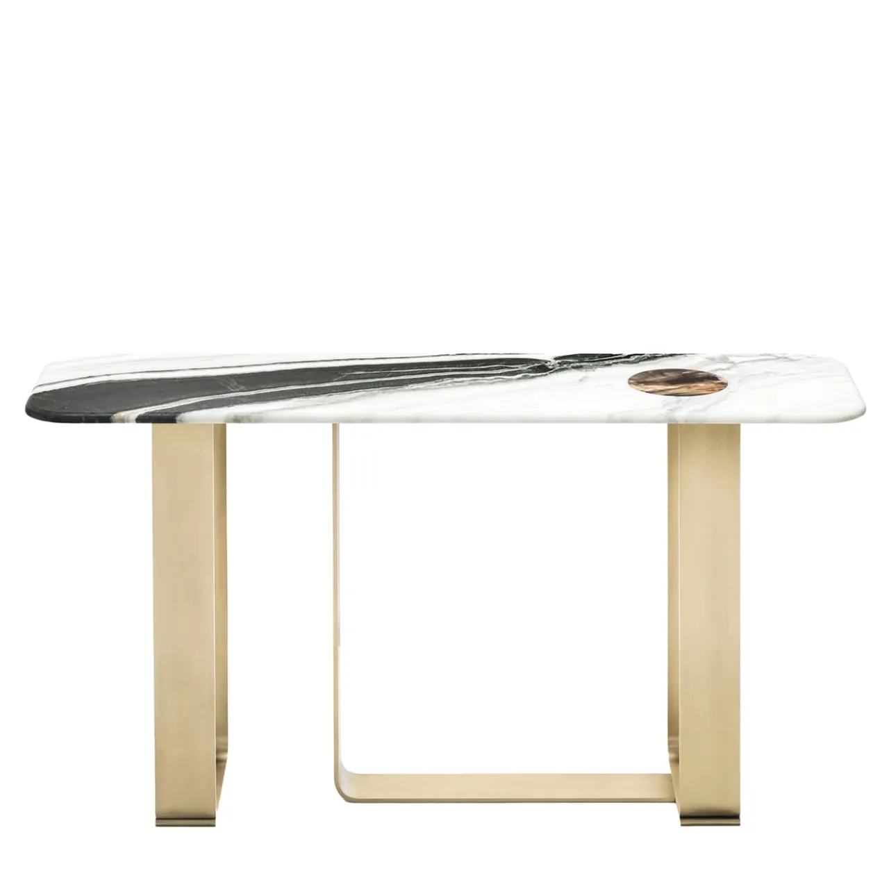 Un’interazione ordinata e dinamica tra cornici in metallo satinato piegato conferisce a questa consolle il suo spirito contemporaneo. Rifinito con bordi smussati e con una raffinata finitura satinata, il pregiato piano in marmo Dalmata seduce con le sue venature a contrasto e cattura ulteriormente lo sguardo grazie a un intarsio circolare lucido in prezioso corno. Grazie alla presenza di materiali naturali pregiati, è del tutto unico.