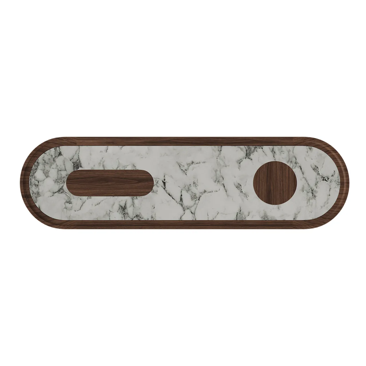 Il tavolo console con base Creta Noce e top in marmo presenta un design ovale elegante sostenuto da due robuste gambe cilindriche. La console mostra una finitura opaca con pori aperti, combinando legno di noce canaletto scuro e un inserto in marmo bianco arabescato sulla superficie superiore. Le incertezze in noce canaletto decorano il top in marmo, evidenziando un equilibrio raffinato tra tessure naturali e artigianato elegante.