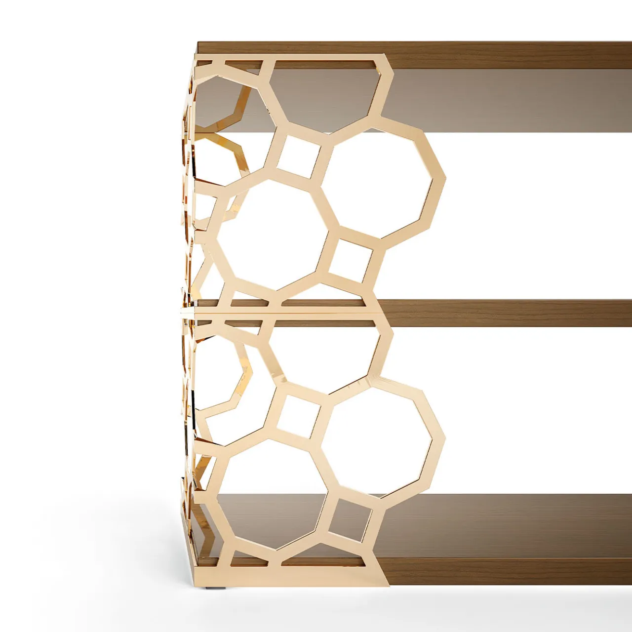 Caratterizzata da linee raffinate, questa lussuosa consolle emana un glamour di metà secolo che si adatterà magnificamente a interni sia moderni che classici, abbinata a una lampada d’effetto o a un elemento decorativo. I lati che abbracciano i tre ripiani in legno di mirto sono formati da forme ottagonali in metallo cromato tagliate al laser e collegate da quadrati rifiniti in oro brillante. Parte della collezione Jenny, questa consolle crea una presenza imponente con le sue linee seducenti.