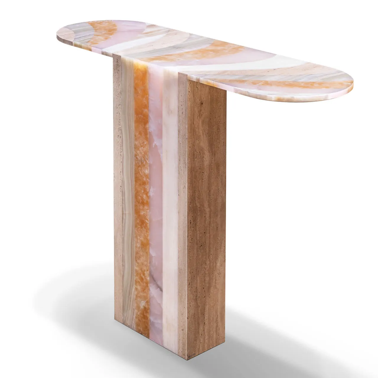 Espressione di femminilità, questa consolle accosta con audacia pietre pregiate per rivelare un look arcobaleno di eccezionale impatto visivo. La combinazione di travertino romano classico, onice rosa, onice miele, onice avorio e onice afgano dà vita a un disegno a righe che si può ammirare in tutta la struttura, dalla gamba monolitica al piano oblungo.