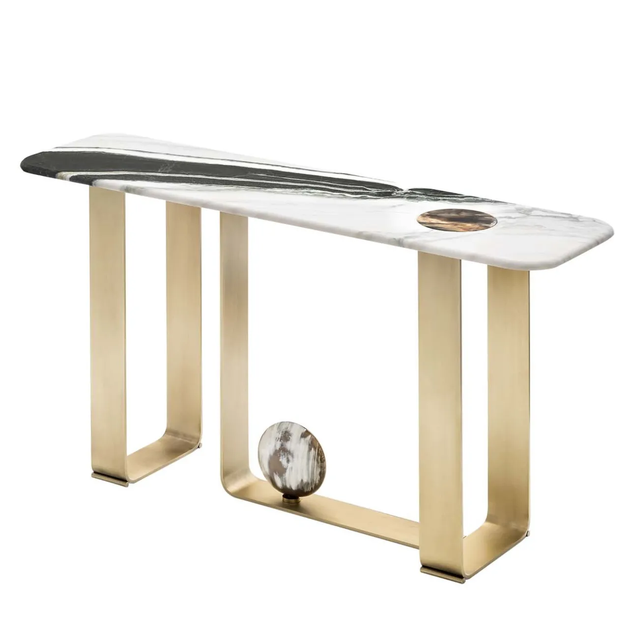 Questa superba consolle è un pezzo scultoreo che impreziosisce un ingresso o un soggiorno moderno con un’eleganza sofisticata e una suggestiva giustapposizione di materiali, colori e texture diverse. Il piano rettangolare con angoli arrotondati è realizzato in marmo Stelvio con finitura satinata e vanta un inserto in corno lucido di forma rotonda che rispecchia il disco decorativo fissato alla base in metallo bronzato (disponibile anche in ottone brunito). Disponibile anche in marmo di Carrara o Cartagine: chiedete al Concierge i dettagli e i prezzi di queste opzioni.