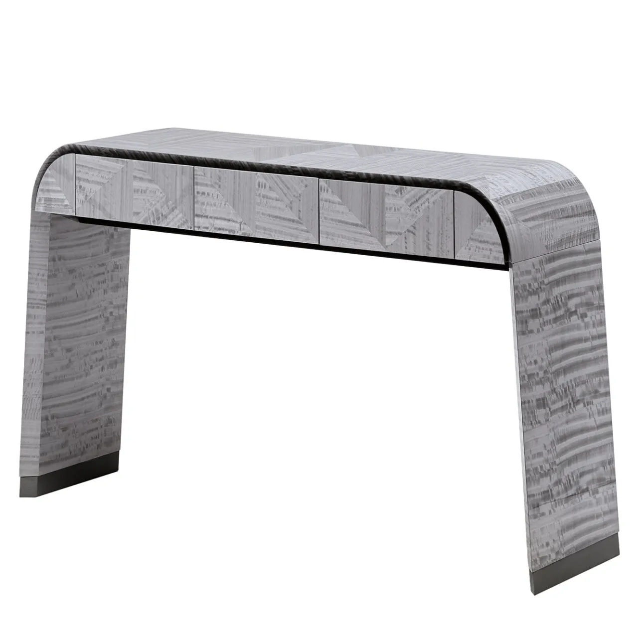 Consolle curva in impiallacciatura di Eucalipto riccio della Tasmania intarsiato con finitura in poliestere lucido. Gambe curve con dettagli in acciaio inox satinato grigio nichel. Tre cassetti esterni a estrazione totale con parte inferiore in tessuto vellutato.