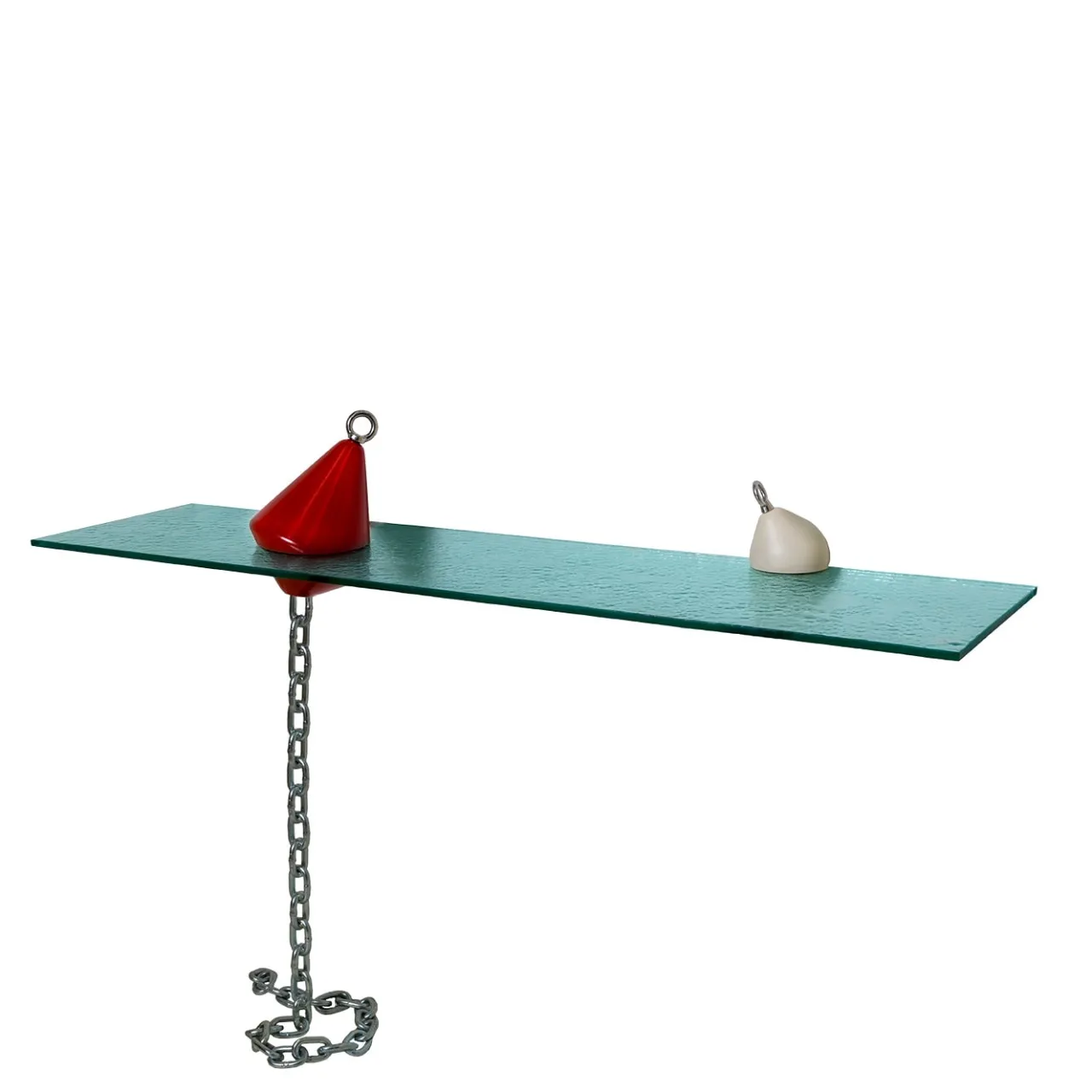 Cercando di sensibilizzare l’opinione pubblica sull’inquinamento da plastica, sorprendendo per il suo equilibrio sfidante e per i suoi colori estivi e brillanti, la console boa sembra galleggiare da terra come se fosse realmente immersa nel mare. La catena d’acciaio che funge da sostegno principale del pezzo, invece di essere appesa, è saldata insieme come un’intera colonna. Il piano in vetro su misura ad effetto acqua è appeso sia sopra la catena sia fissato alla parete attraverso un piccolo gancio nascosto all’interno della boa bianca più piccola.
