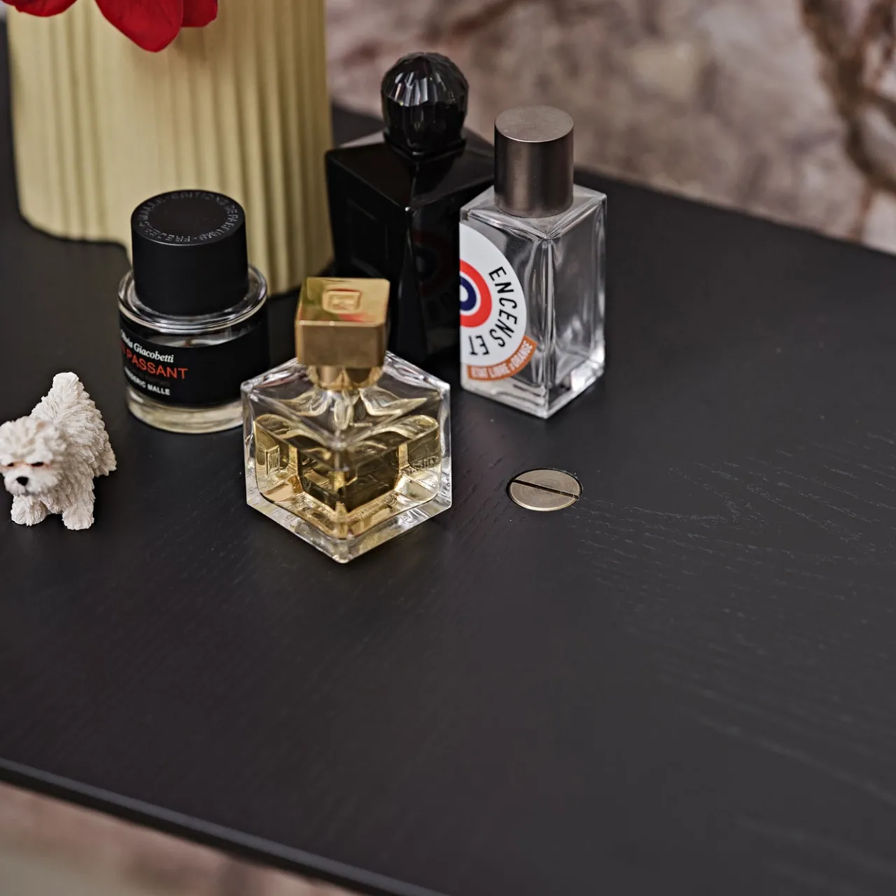 Tanto fresca nei volumi dinamici ed essenziali quanto lussuosa nei dettagli preziosi, questa consolle sintetizza eleganza ed esclusività. L’elemento distintivo è l’inserto metallico brillante che adorna il piano in MDF con un autentico punto di rottura, interrompendo la profondità della sua finitura in frassino color moka, coerentemente abbinata al resto della struttura in frassino massiccio. L’inserto centrale è disponibile nelle finiture oro lucido o bronzo scuro opaco.