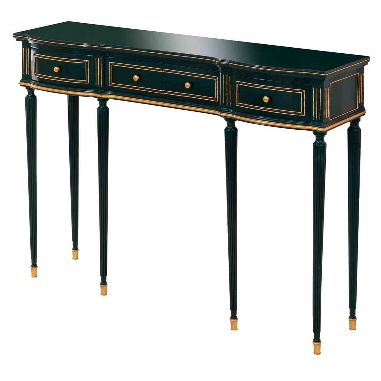 Ricca di un’eleganza senza tempo, questa elegante consolle è un must per gli arredamenti moderni e di metà secolo. La struttura in legno laccato verde presenta un piano aerodinamico, completo di quattro cassetti per il massimo contenimento, sorretto da sei gambe a sciabola con dettagli a cresta e piedi dalla punta dorata. Le decorazioni a perline in bronzo placcato oro 24 carati suggellano l’esclusività del pezzo. Si prega di contattare il Concierge per eventuali opzioni di personalizzazione.