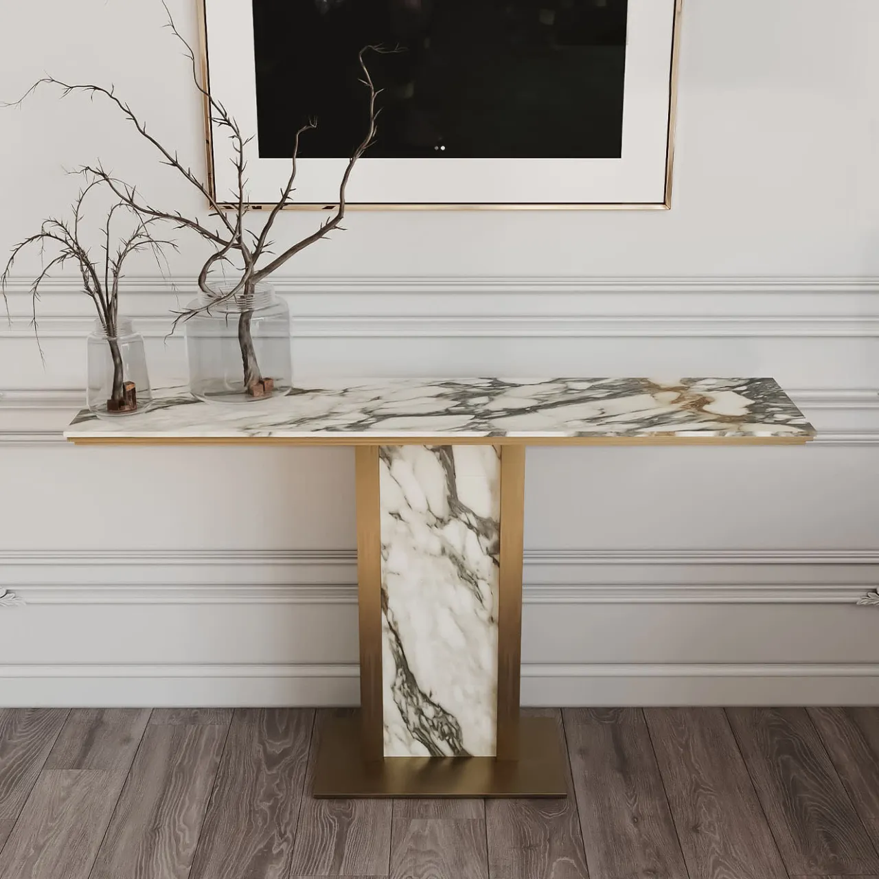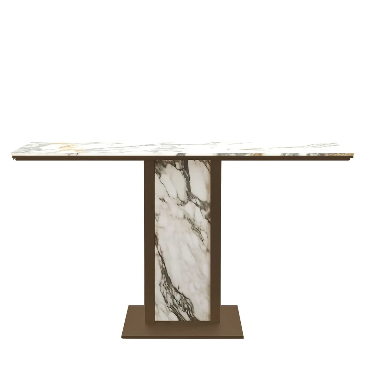 Afon, disegnato da Paolo Ciacci, è un tavolo consolle definito da linee semplici, classiche e geometriche. Questo pezzo moderno è caratterizzato da una struttura centrale in metallo che incornicia una lastra verticale in marmo Paonazzo. Il piano rettangolare, anch’esso in marmo Paonazzo, è sostenuto nella parte inferiore da una struttura metallica in finitura bronzo ombra. La consolle è disponibile in diverse finiture di marmo e metallo ed è personalizzabile. Per ulteriori informazioni, contattare il Concierge.