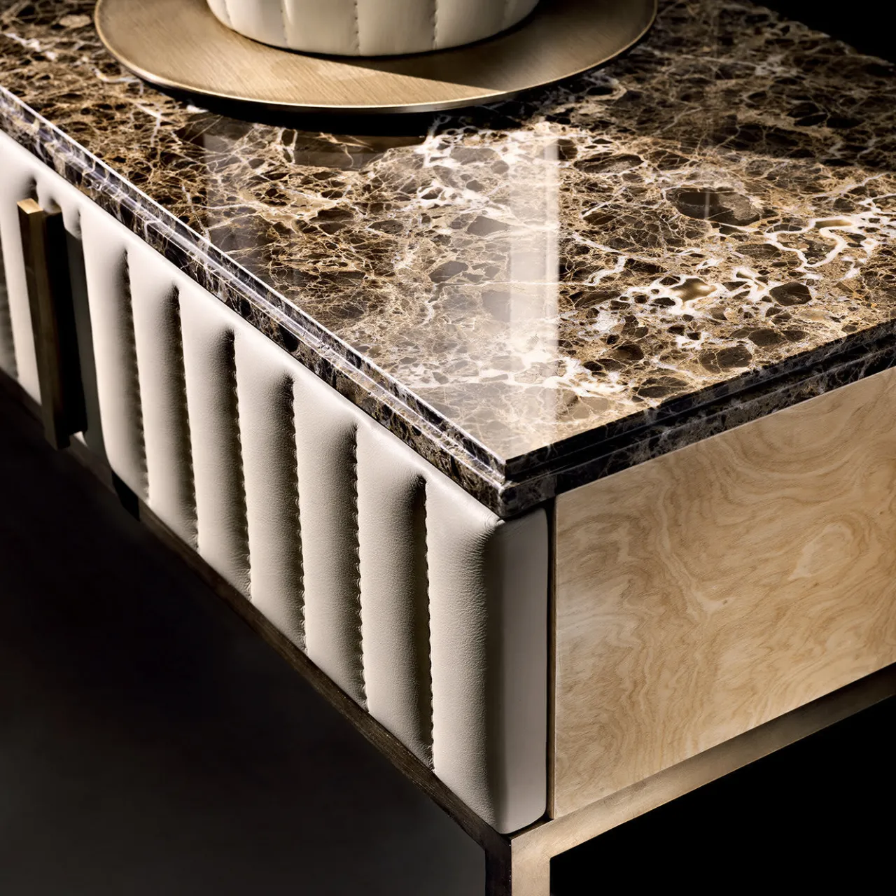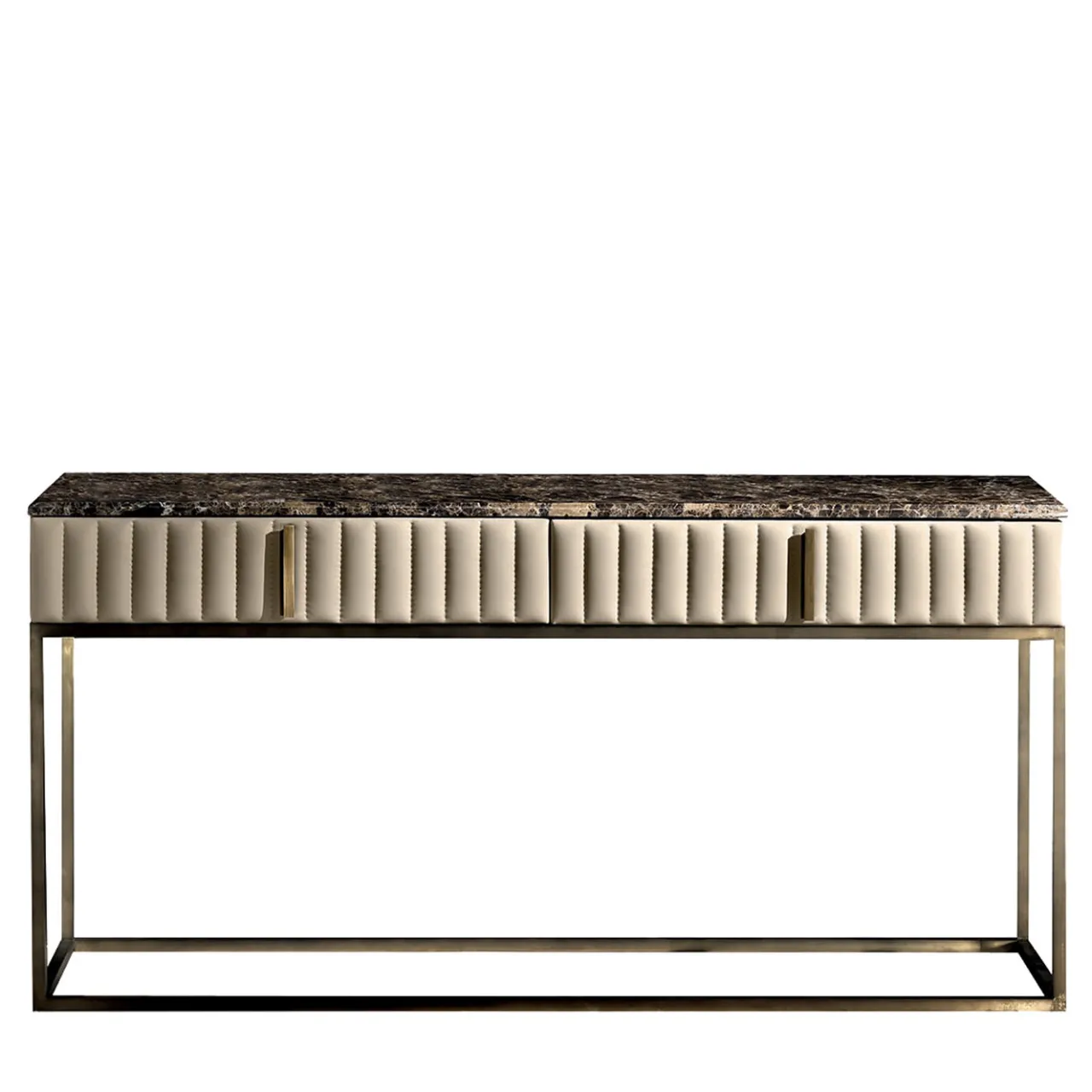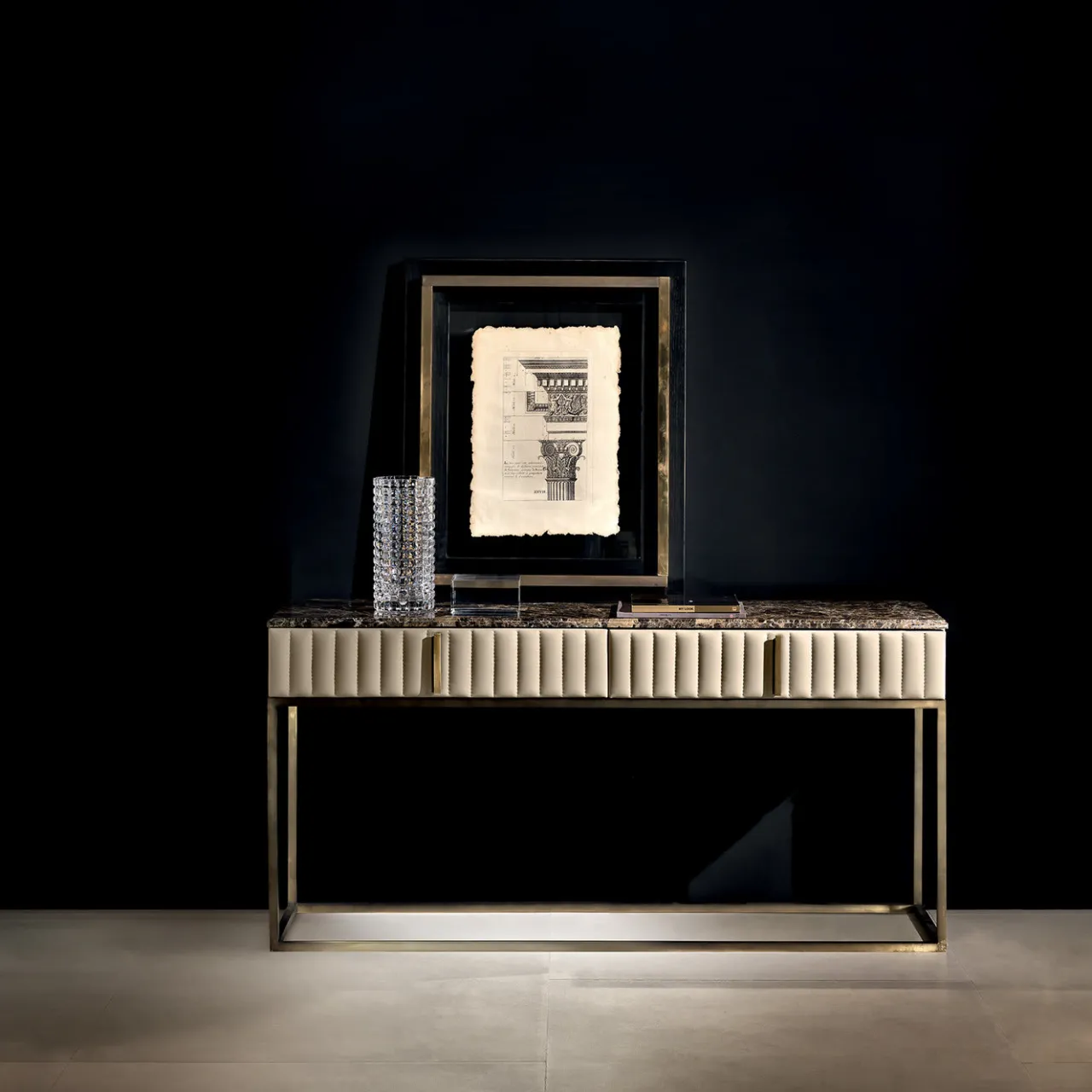 Collocata in salotto o all’ingresso come piano d’appoggio per lampade, vasi, portacandele o libri, questa consolle è un sicuro richiamo visivo. Realizzata in legno con impiallacciatura in radica di mirto e finitura lucida spazzolata, presenta due ampi cassetti con frontali in pelle gros-grain (nella foto: Clayton lumiere 1639) e maniglie rettangolari in ottone brunito. La base tubolare quadrata è in ottone brunito e il piano in marmo Emperador.