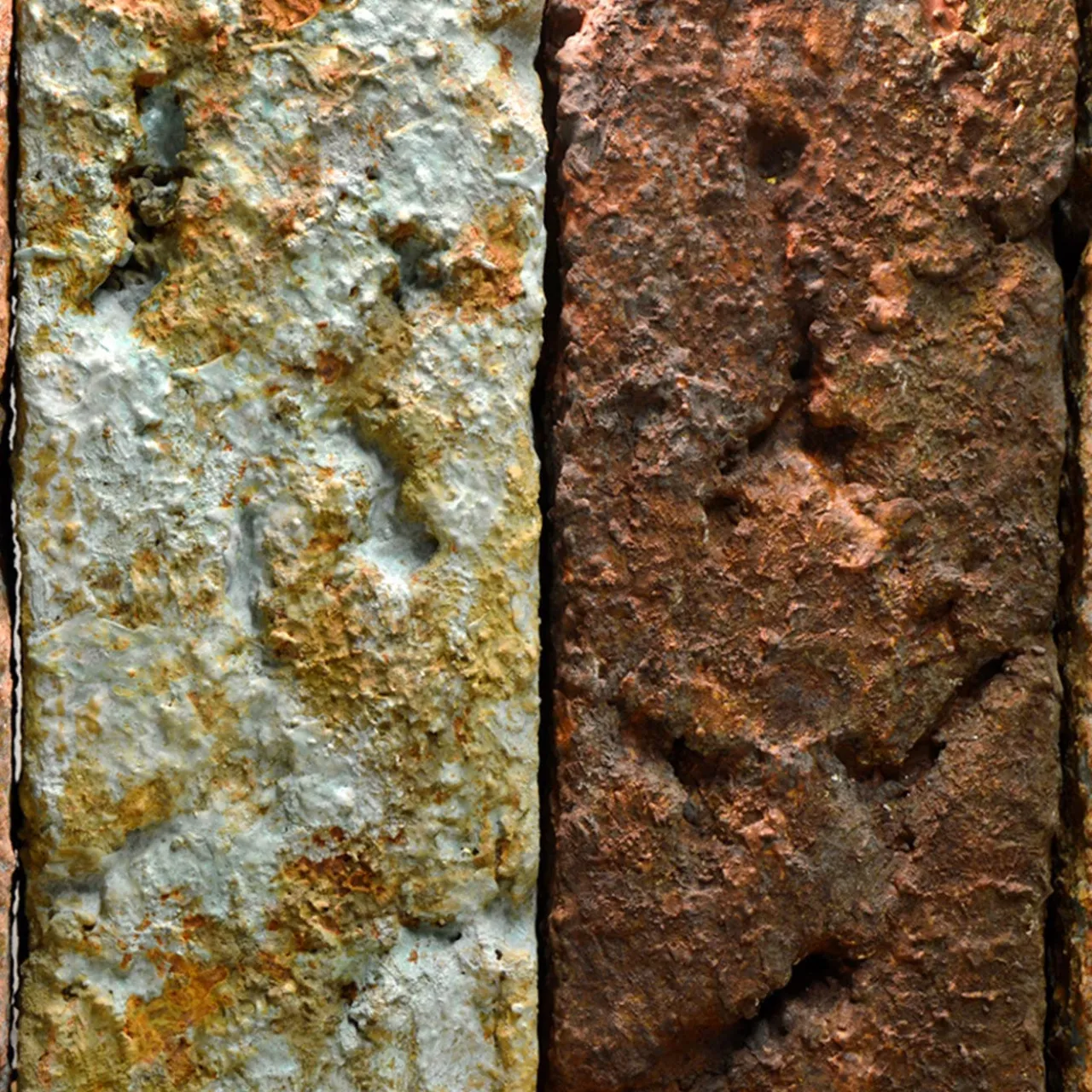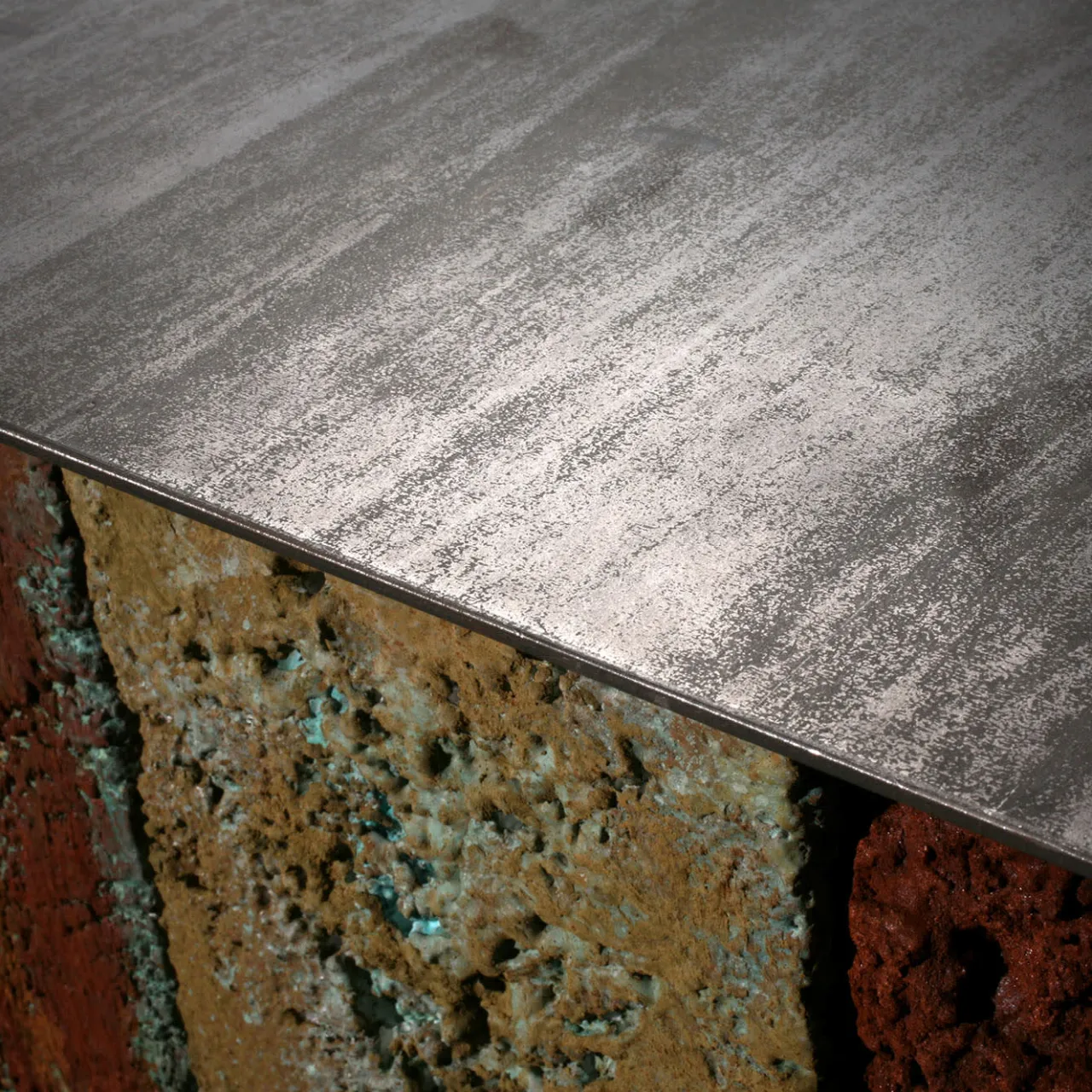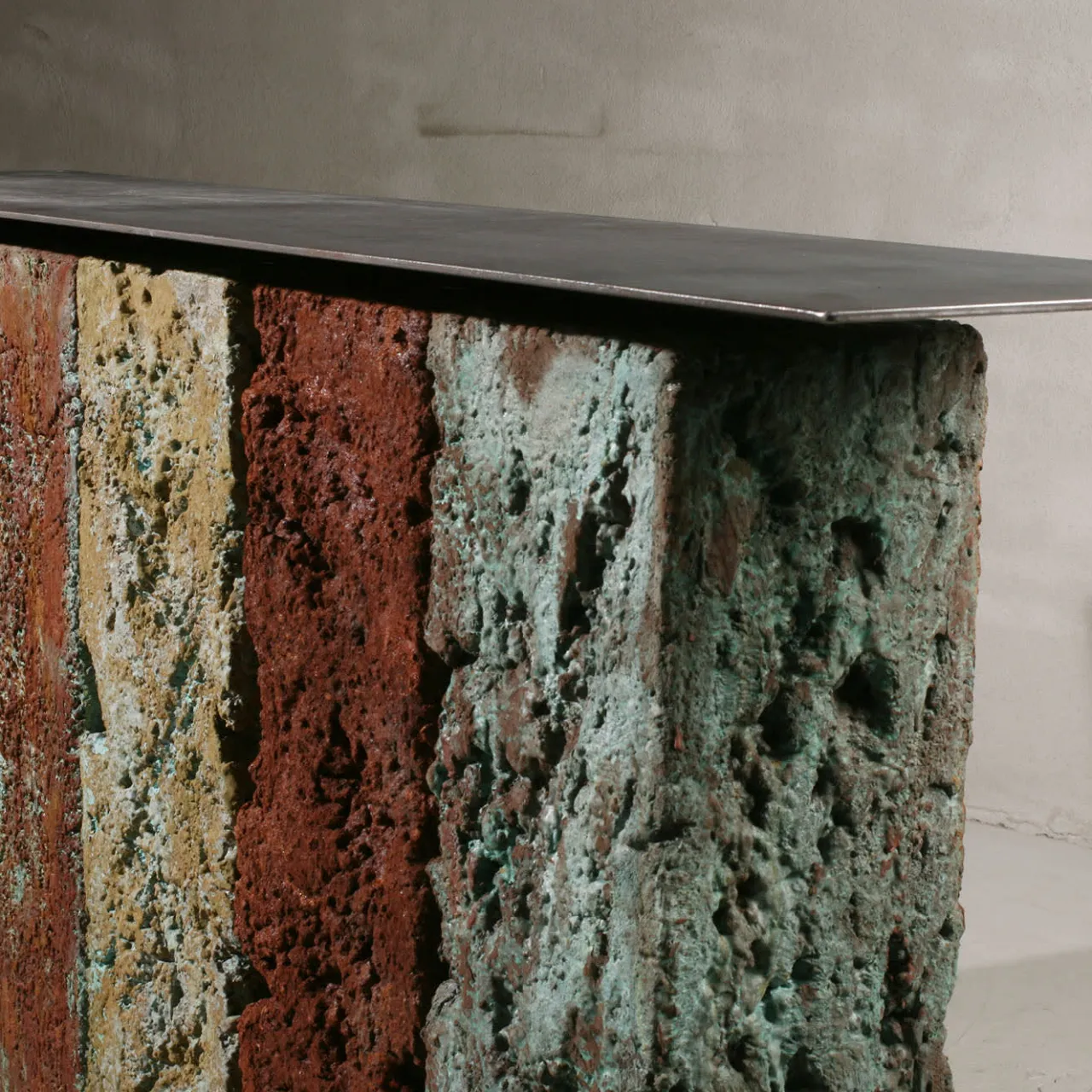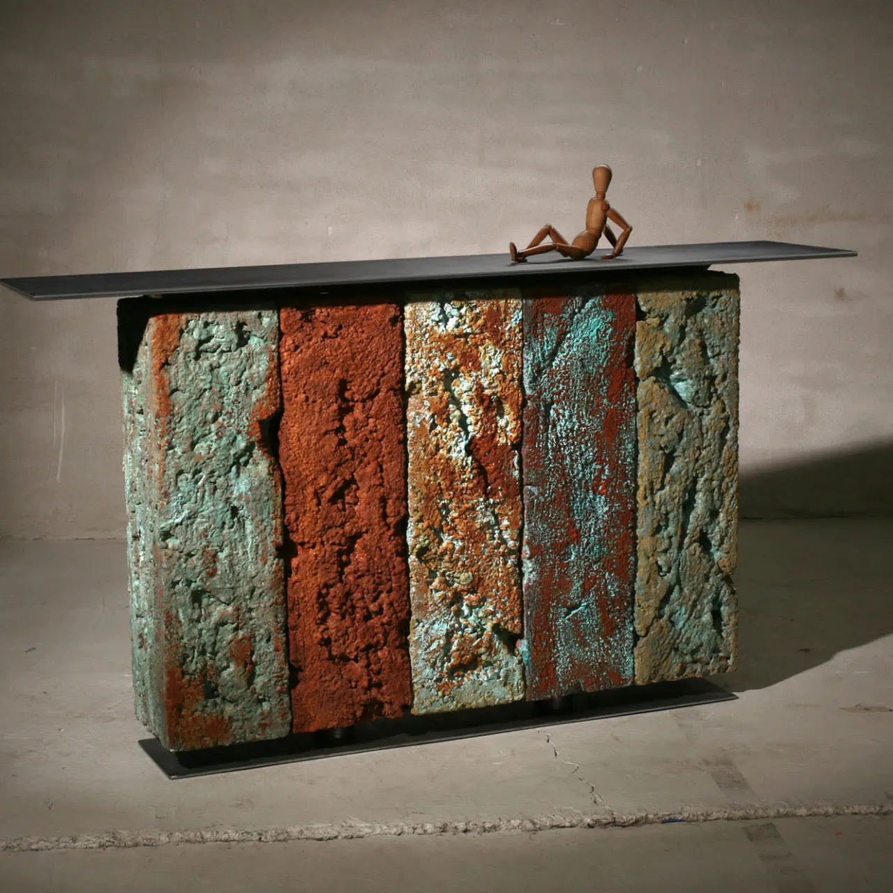 Distinguendosi per l’artigianato scultoreo e l’esplorazione artistica delle ossidazioni metalliche, questa superba console è una vera meraviglia. I cinque solidi di uguali dimensioni emanano personalità distinte, con i loro colori unici e intensi che raccontano storie di epoche passate. Realizzati in acciaio bronzato, il piano e la base sono eleganti e durevoli. Personalizzabile sia nelle dimensioni che nel numero di elementi, ogni console è una creazione su misura per elevare qualsiasi spazio con la sua straordinaria presenza.