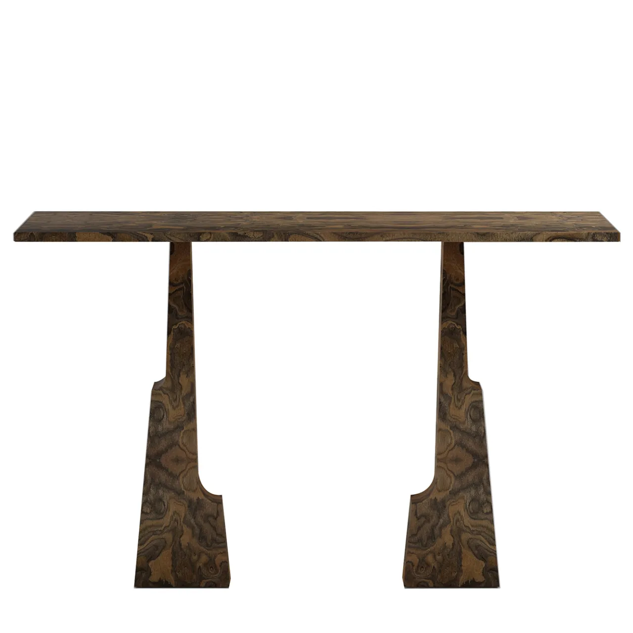 Questa console elegante e visivamente sorprendente presenta un profilo slanciato con due gambe a piedistallo geometriche. Adatta a vari ambienti come soggiorni o ingressi, offre dimensioni e finiture personalizzabili per adattarsi a diversi stili d’interni. La raffinata superficie in legno laccato esalta la sua estetica moderna mantenendo una forte presenza senza sovrastare lo spazio.