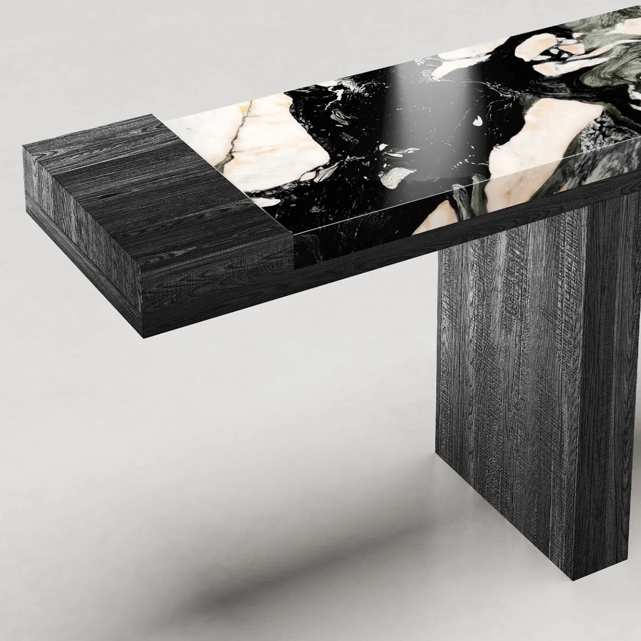 La Consolle After All presenta una struttura in legno di abete anticato, sabbiato e tinto di nero. Il piano in marmo Notre Dame è sostenuto da una struttura a nido d’ape in alluminio, che collega due ali in legno nelle versioni Large e Mid, mentre la versione Small poggia su una base centrale. Il design mette in risalto il materiale stesso, combinando l’abete grezzo di fiume con le inclusioni naturali del marmo Notre Dame, creando un sorprendente contrasto tra forma e materiale. Sono disponibili dimensioni e finiture personalizzate.