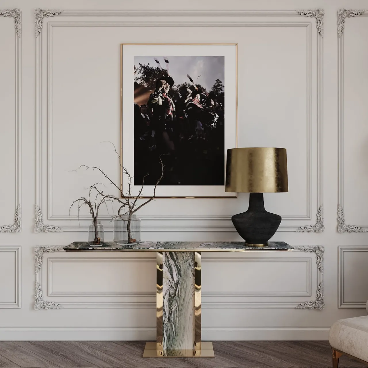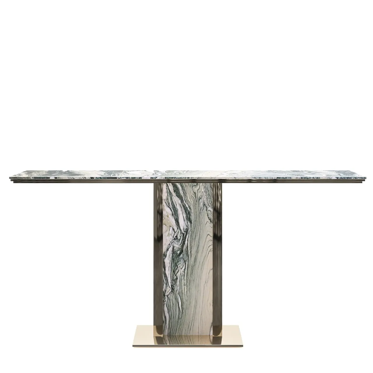 Linee semplici, classiche e geometriche definiscono questa austera consolle rettangolare. Questo pezzo moderno è composto da una struttura centrale in metallo che incornicia una lastra verticale in marmo Cipollino Verde. Il piano rettangolare della consolle, anch’esso in Cipollino Verde, è sostenuto da una struttura metallica nella parte inferiore, realizzata in finitura bronzo lucido. La consolle è disponibile in diverse finiture di marmo e metallo ed è personalizzabile. Per maggiori informazioni, contattare il Concierge. A causa della natura del materiale, il prodotto può variare leggermente.