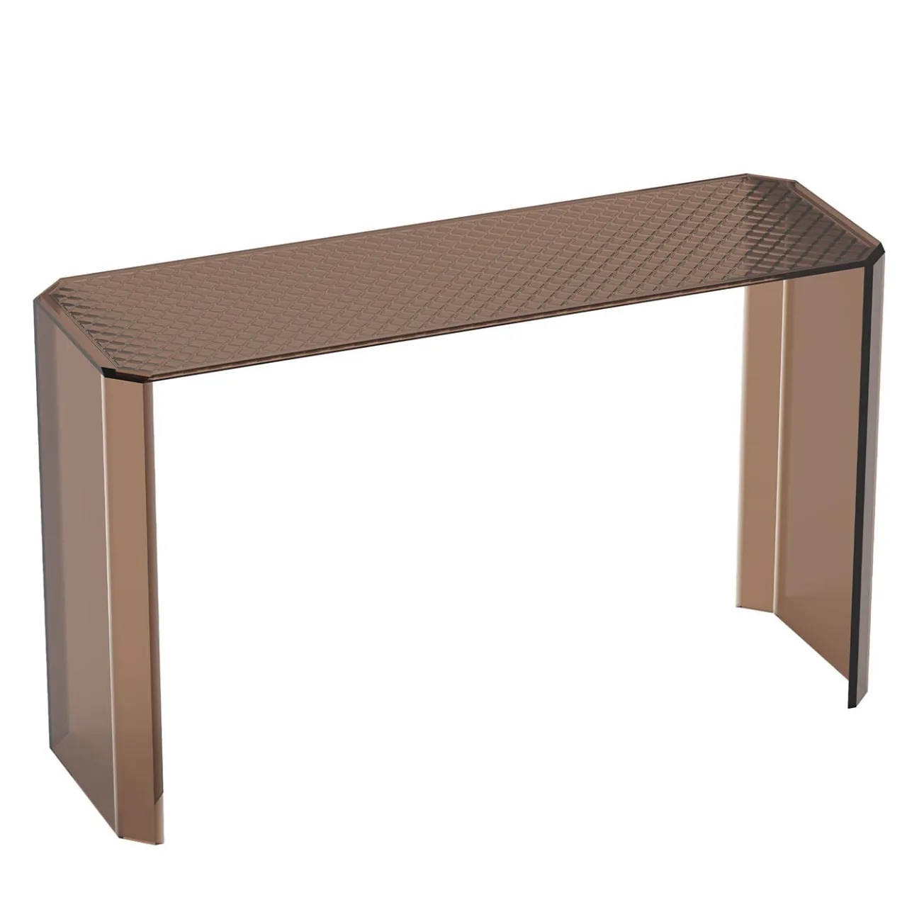 Elegante consolle in cristallo extrachiaro disegnata da Marc Krusin, caratterizzata da un elegante motivo a diamante sabbiato. Disponibile in grigio fumo, bronzo o vetro extrachiaro, questo pezzo aggiunge un tocco di raffinatezza a qualsiasi spazio. La consolle è realizzata con precisione artigianale e può essere scelta con motivi a diamante o a triangolo, rendendola un’aggiunta versatile agli interni moderni.