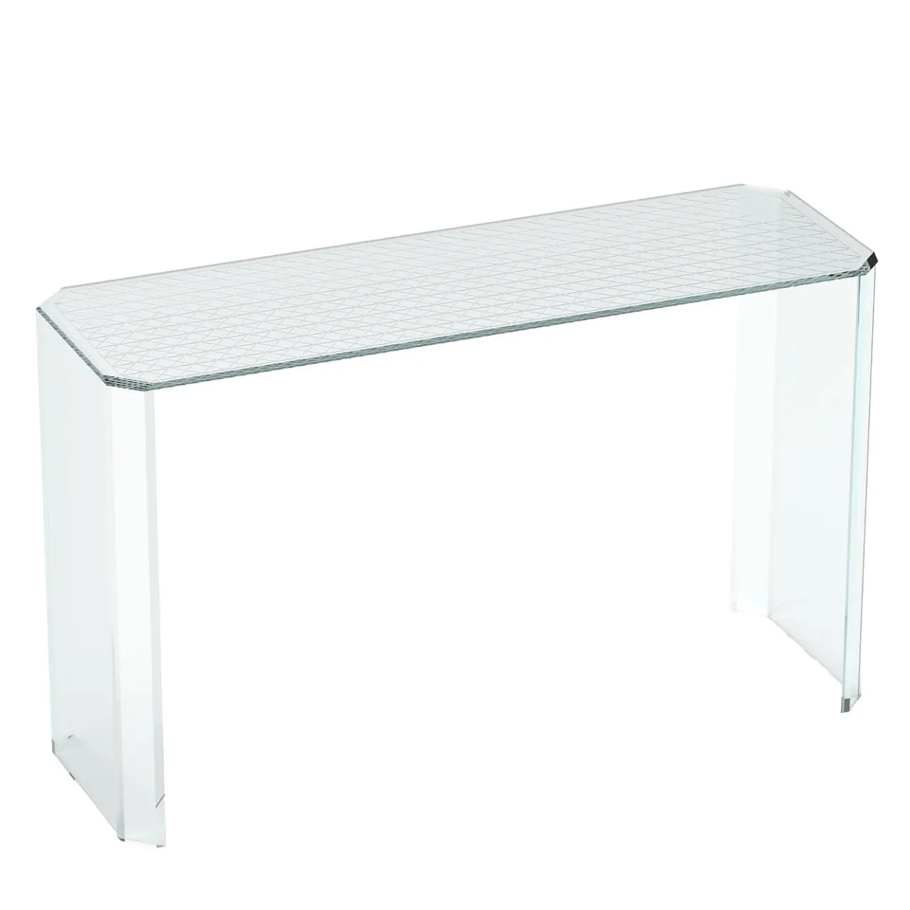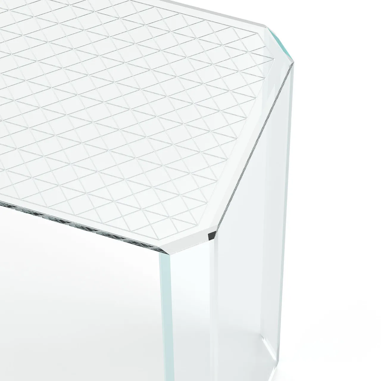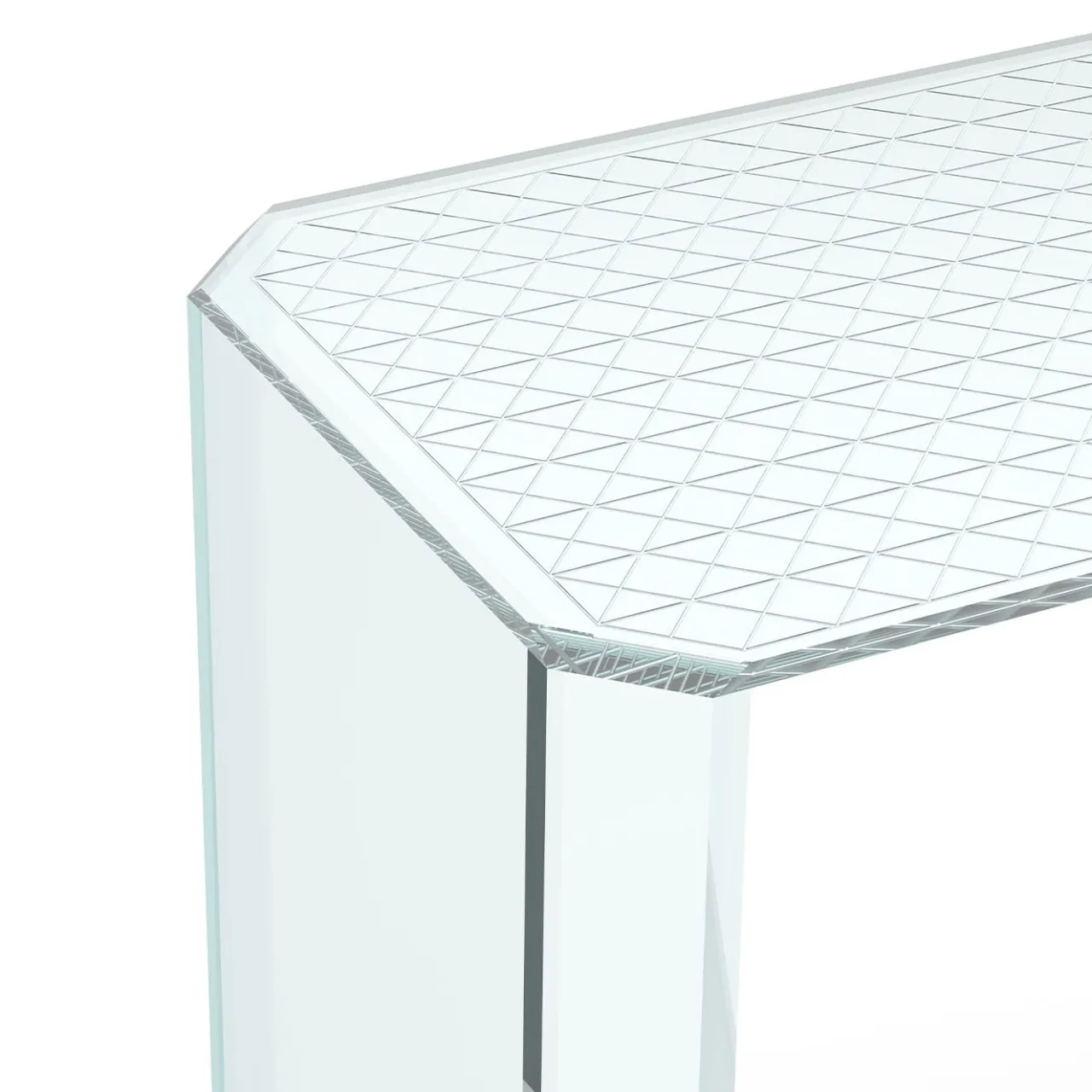 Una sofisticata consolle in cristallo extrachiaro di Marc Krusin, caratterizzata da un motivo a triangolo sabbiato. Disponibile anche in grigio fumo o bronzo, offre la possibilità di scegliere tra motivi a diamante o a triangolo per un’estetica su misura. Il design minimalista e i dettagli intricati la rendono un’aggiunta elegante a qualsiasi spazio moderno. Per ulteriori informazioni, rivolgersi al Concierge.