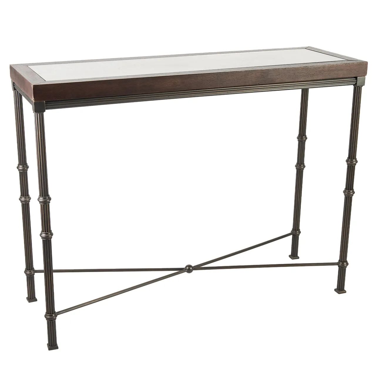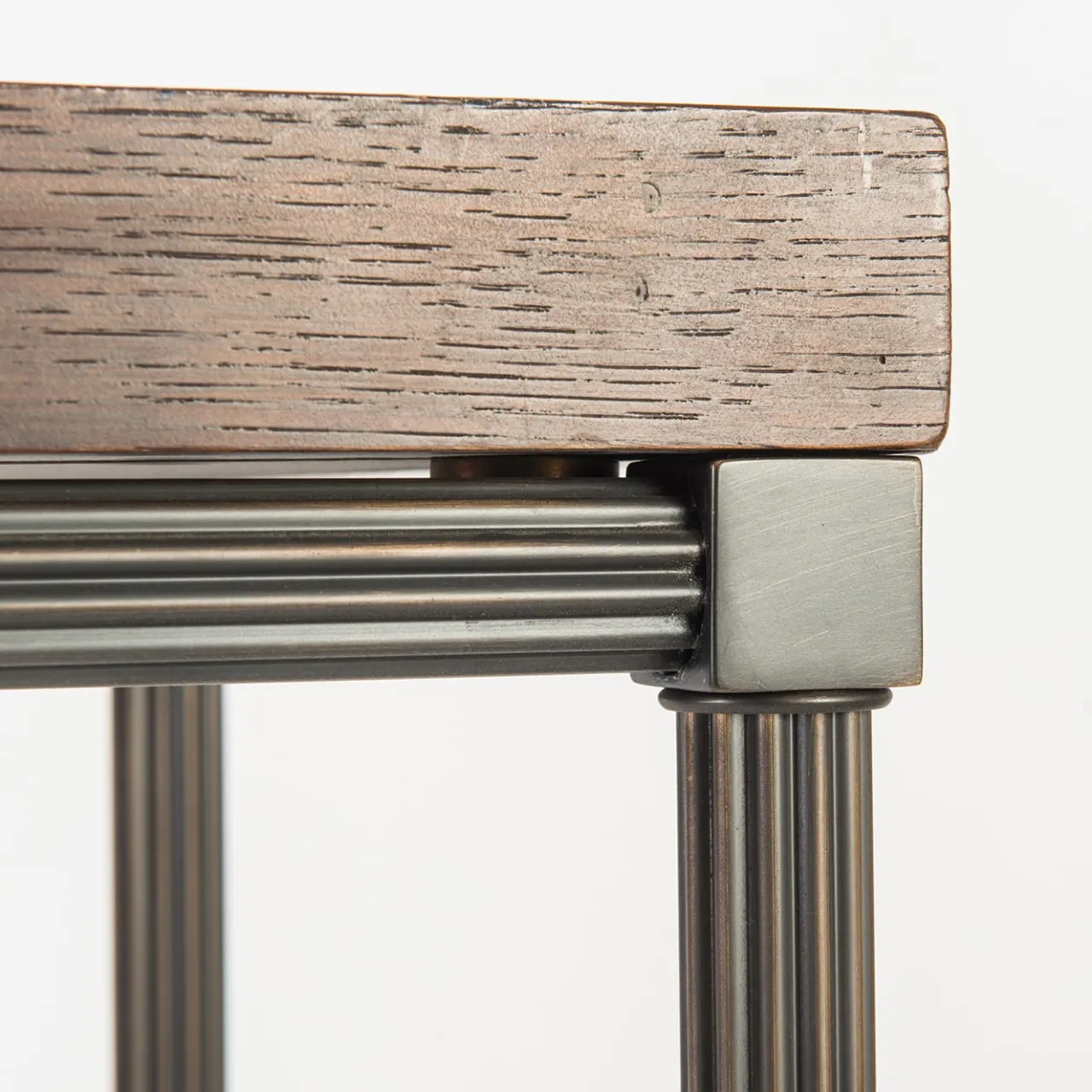La consolle “Onde” è un affascinante pezzo d’arredamento contemporaneo. La sua struttura è realizzata in ottone scuro brunito a coste, che crea un effetto dinamico e increspato. Il piano in rovere massiccio presenta un inserto a specchio anticato che aggiunge un tocco di eleganza e profondità.