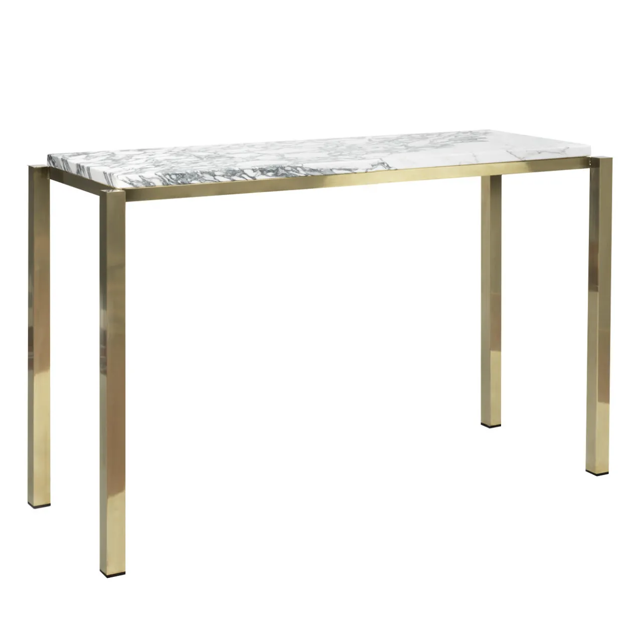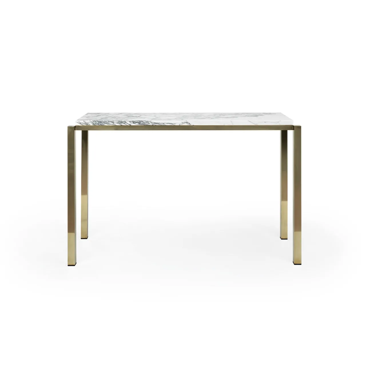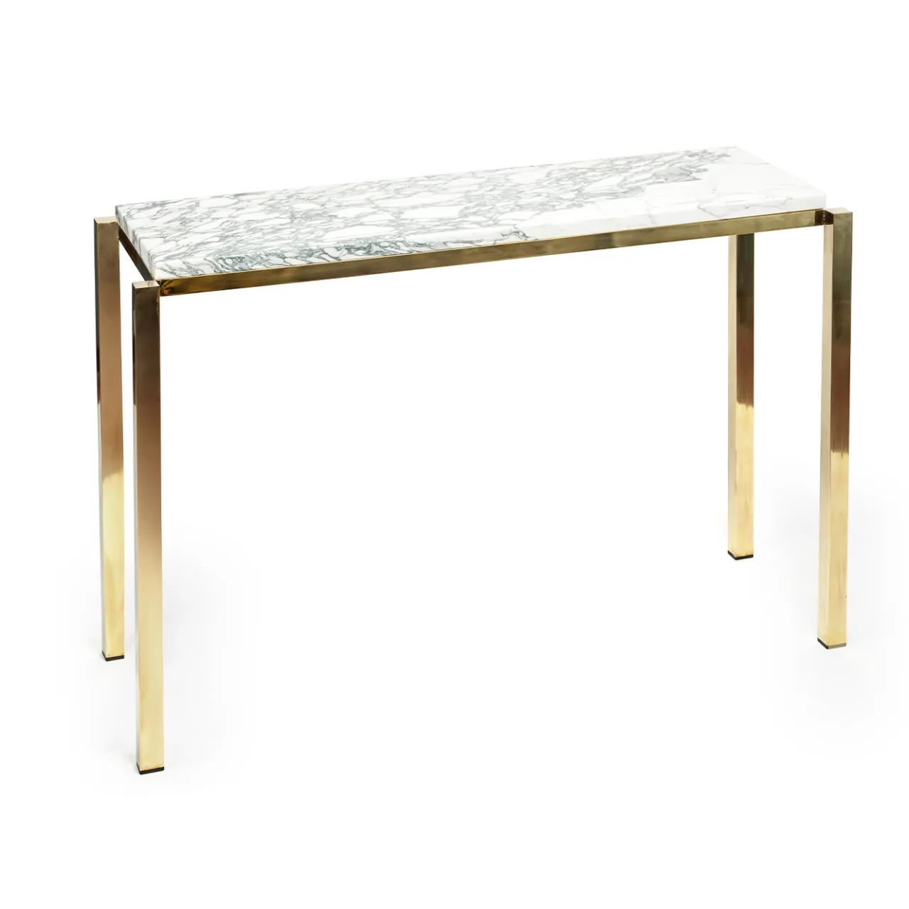 Questa consolle è un pezzo di grande fascino visivo, interamente realizzato a mano con un’esclusiva combinazione di materiali raffinati. È composta da un piano rettangolare realizzato con l’esclusivo marmo Arabescato Corchia e poggia elegantemente su quattro gambe dritte in metallo dorato lucido. Essenziale ma elegante, questa consolle sarà un’aggiunta di stile a un salotto o a un foyer moderno.