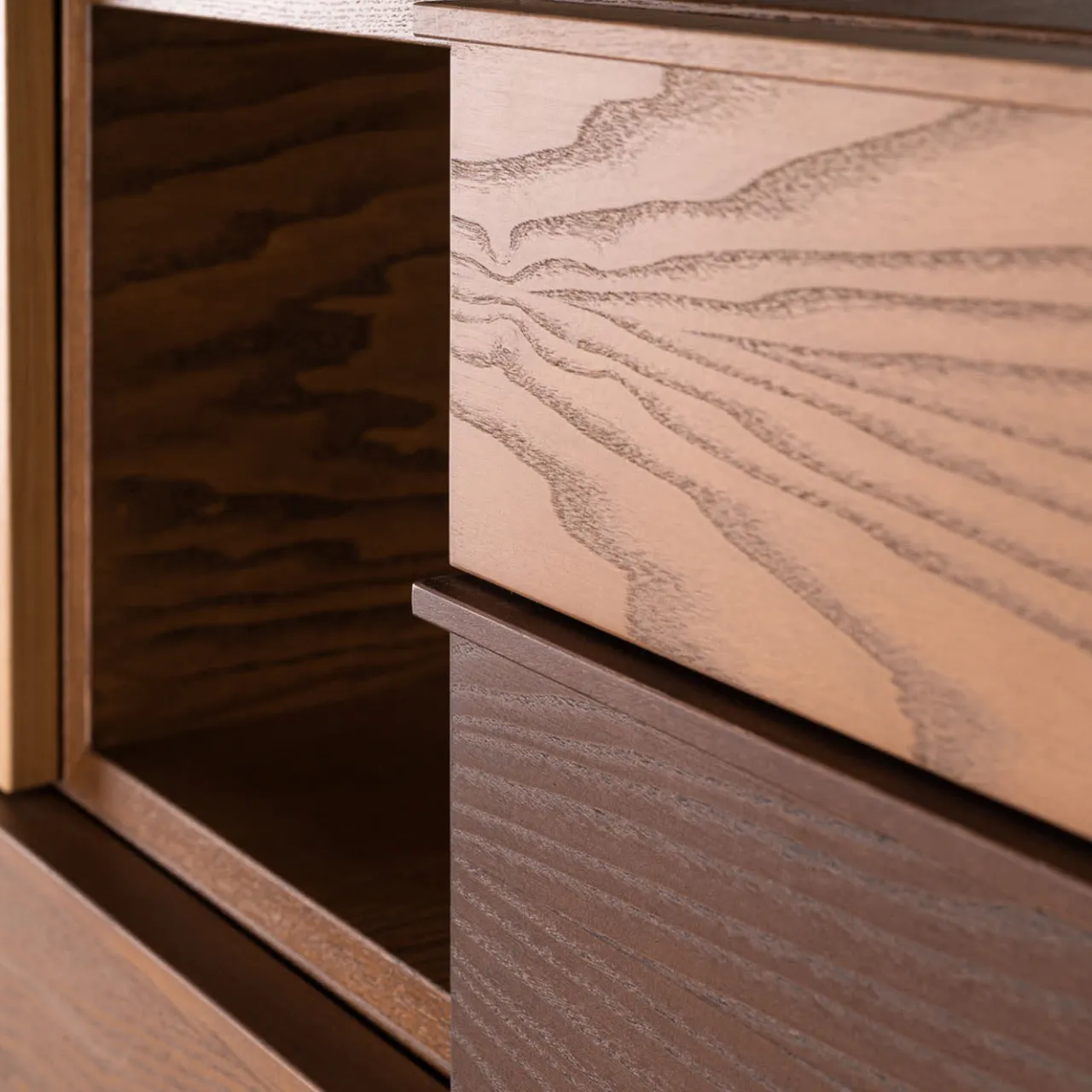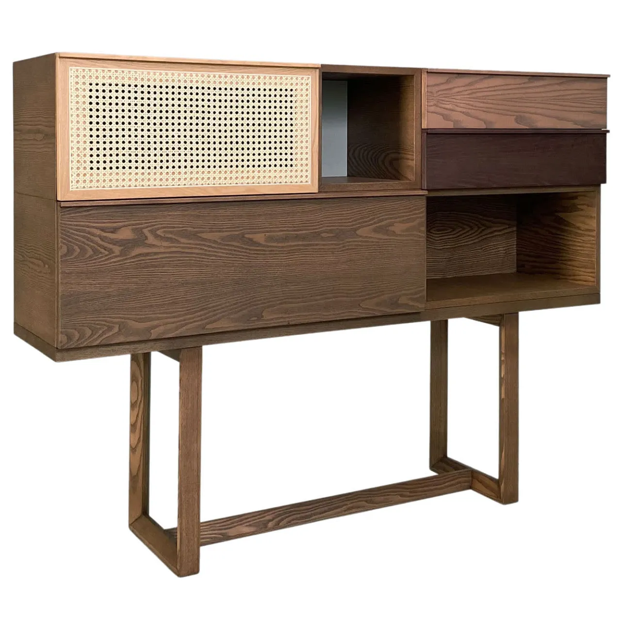 Complemento perfetto della libreria Swing, questa raffinata consolle sarà un accento distintivo e sofisticato per l’arredamento dell’ingresso di una casa contemporanea. Realizzata in legno di frassino, la sua forma di ispirazione architettonica presenta due cassetti, due vani a giorno, un’anta in paglia di Vienna e un’anta a ribalta. Per ulteriori dettagli, consultare il Concierge.