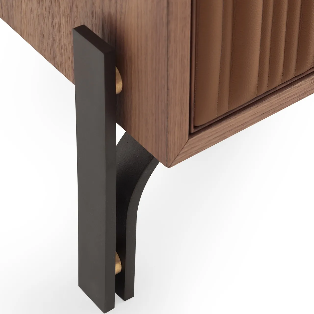 Ispirata all’haute-couture, questa credenza rivela la sua eleganza sartoriale attraverso il disegno irregolare a canali della pregiata pelle color cognac che riveste le due ante push-pull. Dotata di ripiani in vetro fumé e di tre pratici cassetti, presenta il pregiato noce canaletto come impiallacciatura della struttura in MDF. La base è composta da elementi cilindrici in metallo curvato con dettagli in ottone.